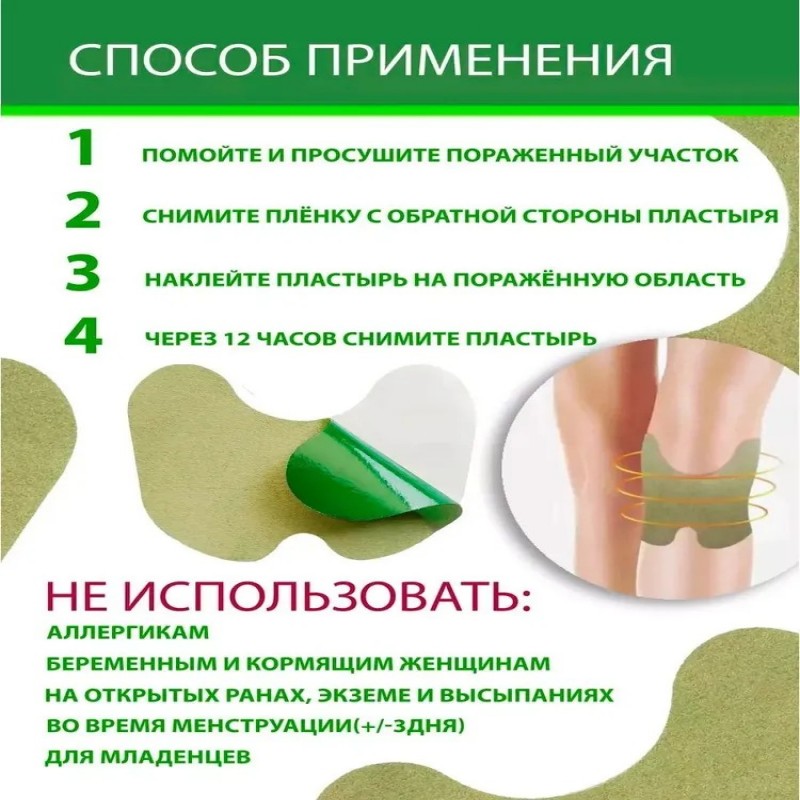 Они идеально подходят для тех, кто страдает от боли в коленях и хочет найти быстрое и эффективное решение. Не беспокойтесь о безопасности, наши пластыри не содержат вредных химических веществ и абсолютно безопасны для взрослых и детей.