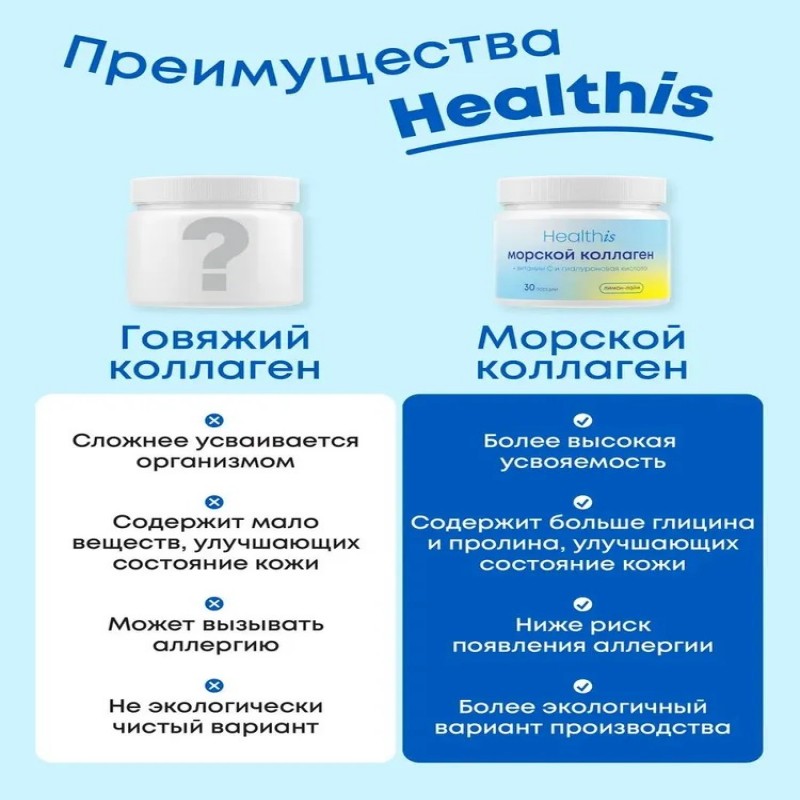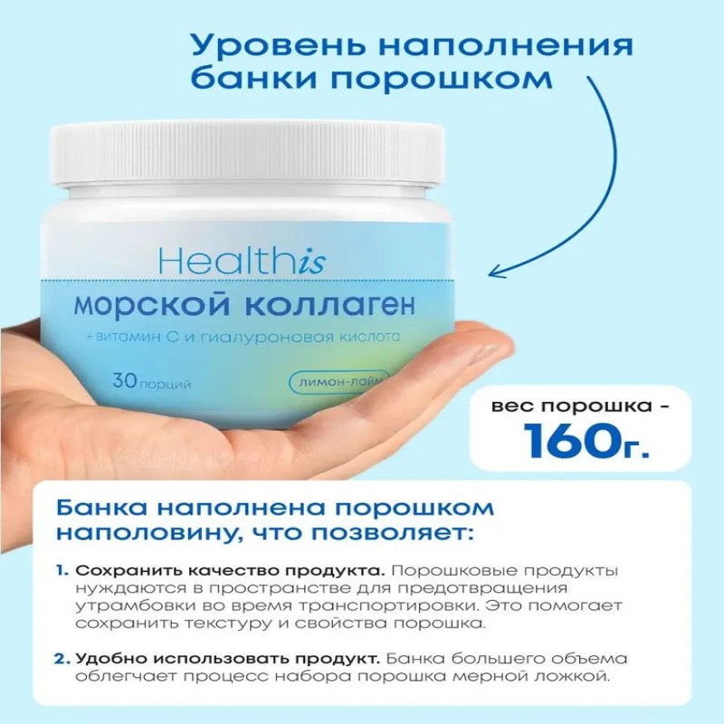 Морской коллаген в порошке от бренда HealthIs – это незаменимая поддержка здоровья костей, суставов, а также молодости кожи, волос и ногтей. Концентрация аминокислот в морском коллагене напитывает кожу, делая ее более эластичной. Более того, он укрепляет структуру волос и ногтей, препятствуя их ломкости.