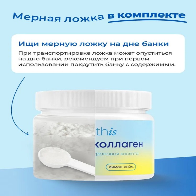 коллаген гидролизованный морской I типа (пептиды), витамин С (аскорбиновая кислота), гиалуроновая кислота, сахарозаменитель сорбит Е420, пищевой ароматизатор идентичный натуральному «Лимон-лайм».