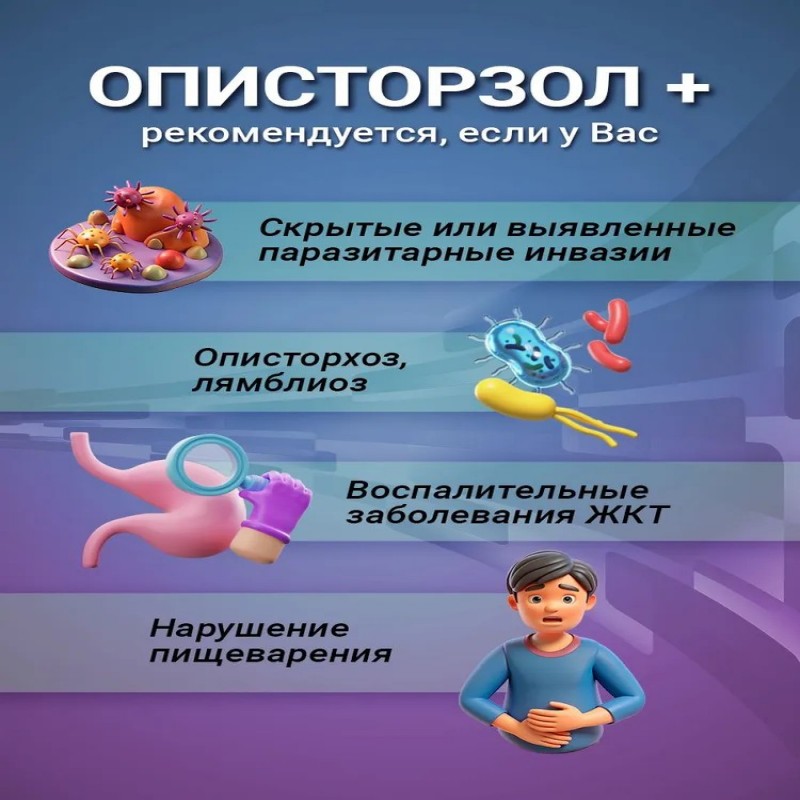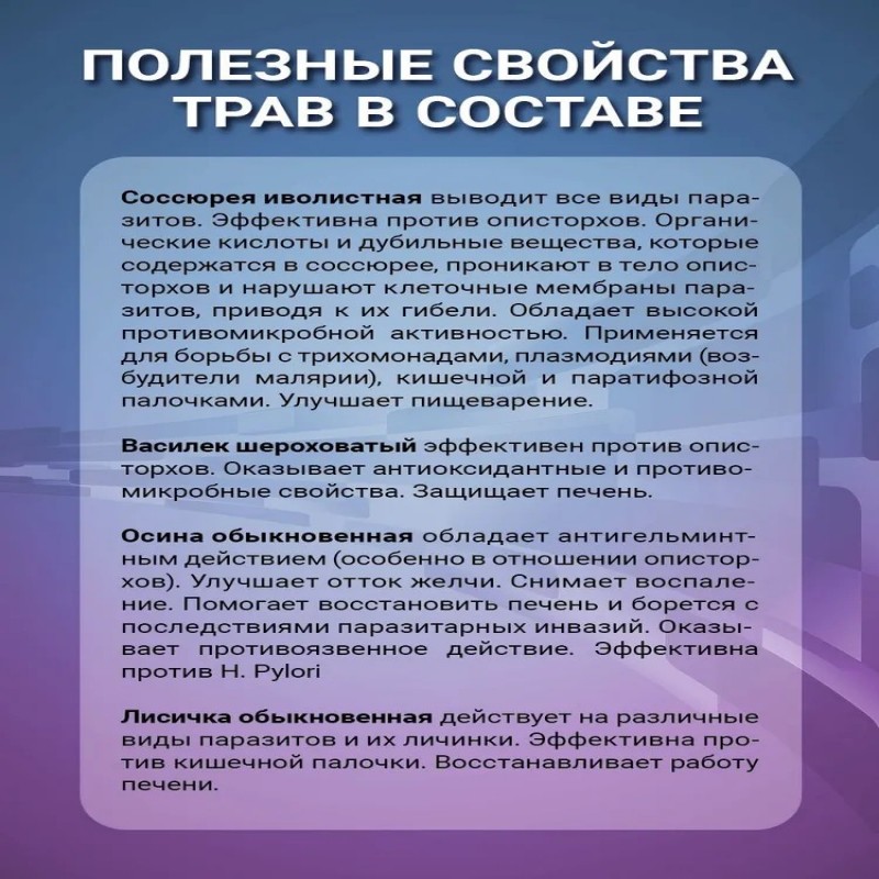 омпоненты способствуют: Выраженному противоописторхозному и противолямблиозному свойствам; Антигельминтной, бактерицидной, противопротозойной и противогрибковой активности; Спазмолитическому и желчегонному действию; Уменьшению воспалительных явлений, регенерации слизистой оболочки желудочно-кишечного тракта; Гастропротекторному, репаративному, противоязвенному свойству; Улучшению моторики желудочно-кишечного тракта; Повышению устойчивости и сопротивляемости организма при повторной инвазии.