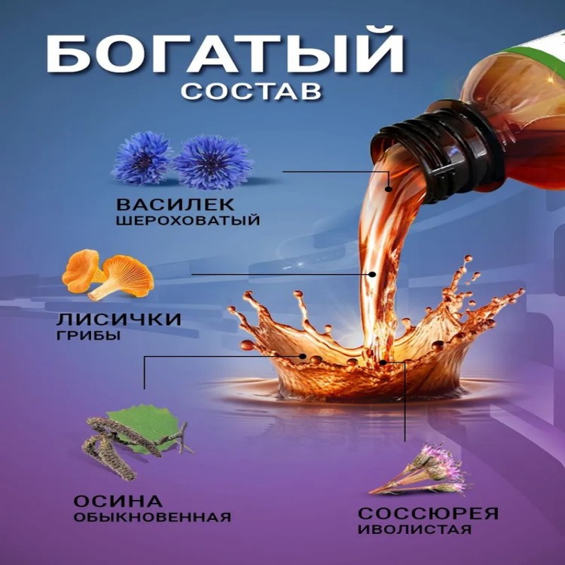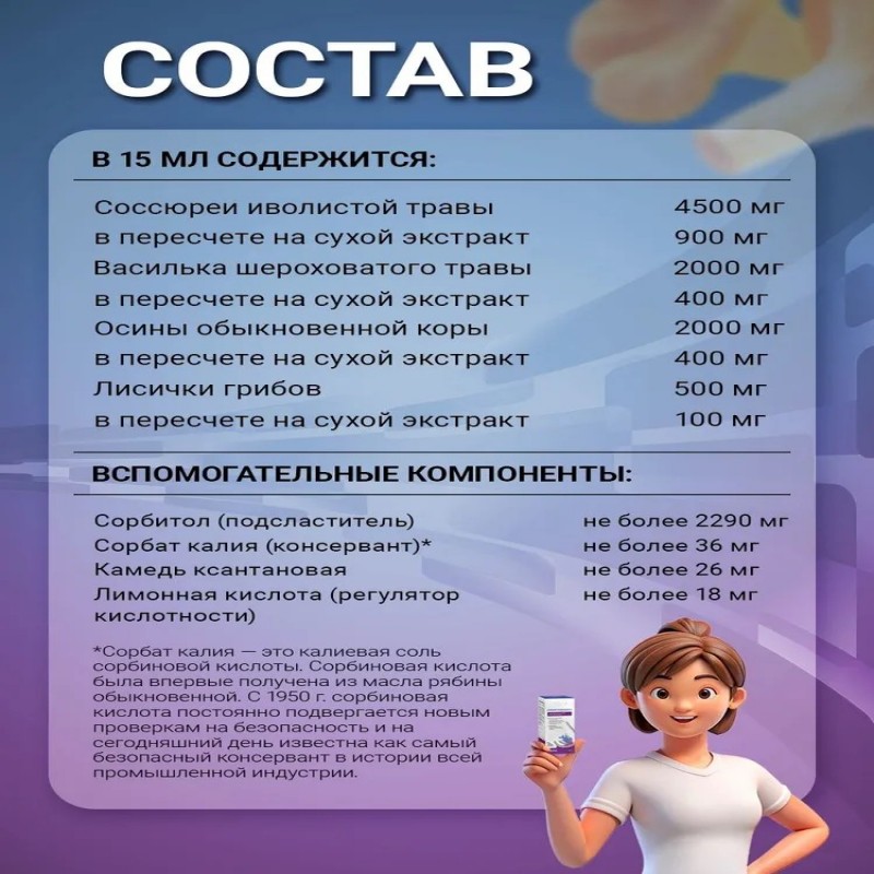 Раствор для приема внутрь (1:1) 15 мл (18 г), мг Соссюреи иволистной травы 4500 мг в пересчете на сухой экстракт 900 мг Василька шероховатого травы 2000 мг в пересчете на сухой экстракт 400 мг Осины обыкновенной коры 2000 мг в пересчете на сухой экстракт 400 мг Лисички грибов 500 мг в пересчете на сухой экстракт 100 мг Вспомогательные компоненты: Сорбитол (подсластитель) не более 2290 мг Сорбат калия (консервант) не более 36 мг Камедь ксантановая не более 26 мг Лимонная кислота (регулятор кислотности) не более 18 мг Вода очищенная q.s.