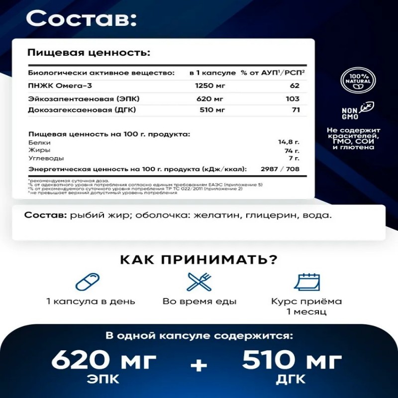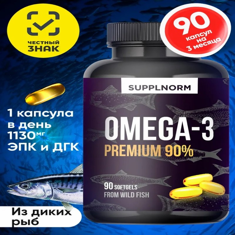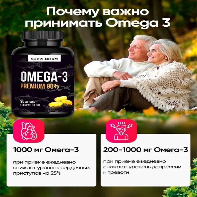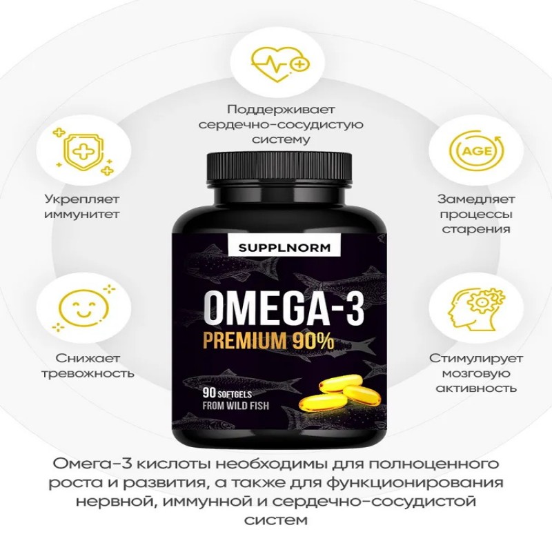 Омега-3 1000 - это БАД для нервной системы, для мозга, для сердца и сосудов, для иммунитета. Омега3-витамины для женщин, это витамин красоты для здоровья волос и кожи. Omega 3 содержит рыбий жир из дикой рыбы: анчоусы, сардины, скумбрия. Упаковки Omega 90 капсул хватит на 3 месяца приема.1 капсула Омега-3 в день. Как принимать витамины Омега-3: курс Omega 3 - 1 месяц, при необходимости прием можно повторить.