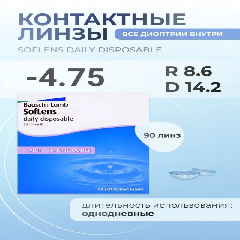 SofLens® Daily Disposable - это экономичный вариант однодневных линз, которые не требуют ежедневного ухода и помогают обеспечить высокое качество зрения благодаря асферической оптике.