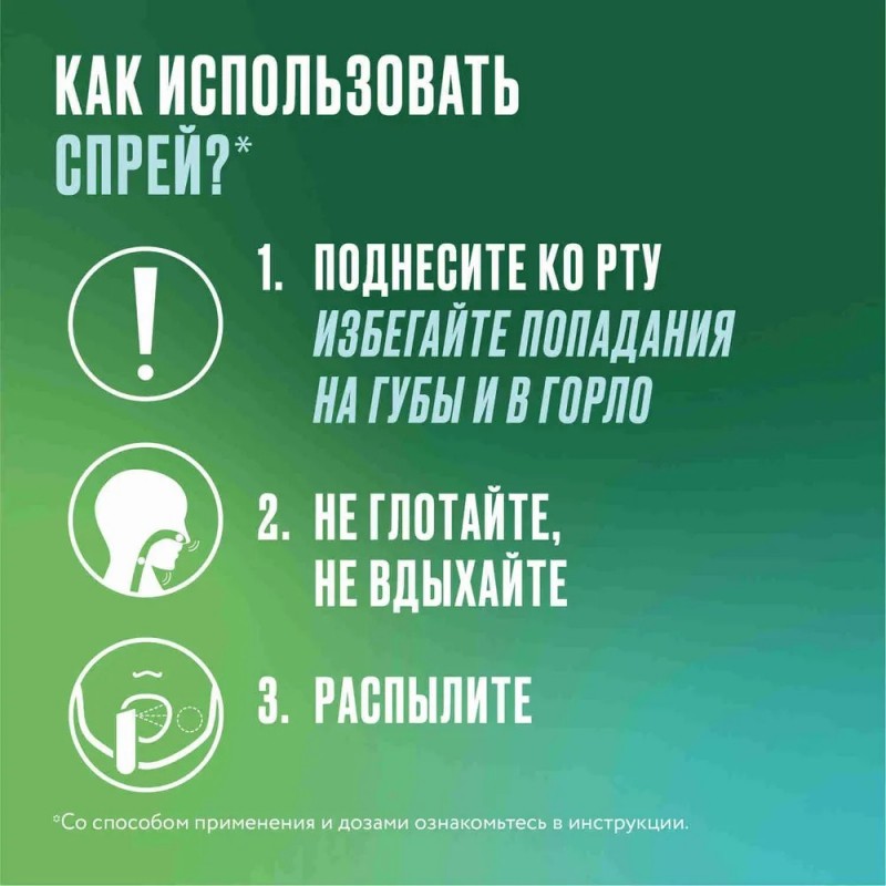 Во время использования спрея прием пищи и жидкости не рекомендуется.