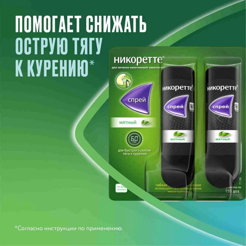 Спрей Никоретте® следует использовать во всех случаях возникновения тяги к курению или для недопущения тяги в ситуациях, которые могут ее провоцировать.