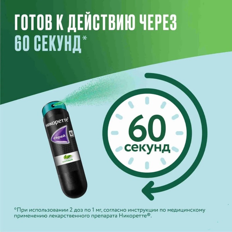 Спрей Никоретте® следует применять в тот момент, когда возникает непреодолимое желание закурить. После подготовки спрея к использованию (см. ниже Инструкцию по использованию при первом применении спрея) поднесите наконечник спрея как можно ближе к открытому рту. Нажмите на дозатор сверху, высвободив таким образом одну дозу препарата в полость рта; следует избегать попадания спрея на губы. Чтобы исключить попадание вещества в дыхательные пути, в момент нажатия на дозатор не следует совершать вдох. Для достижения наилучших результатов не сглатывайте слюну в течение нескольких секунд после впрыскивания.
