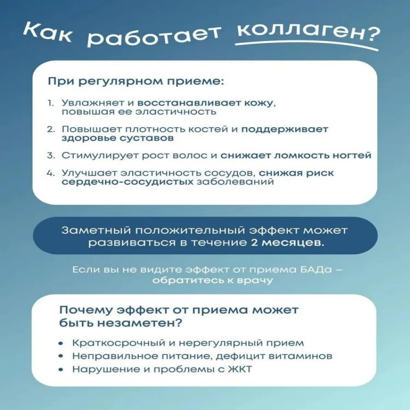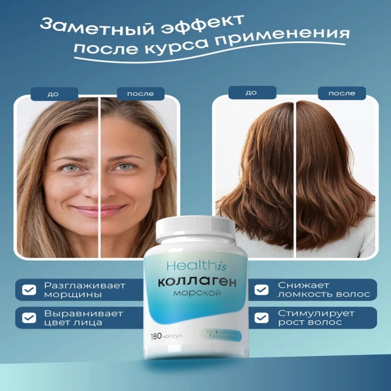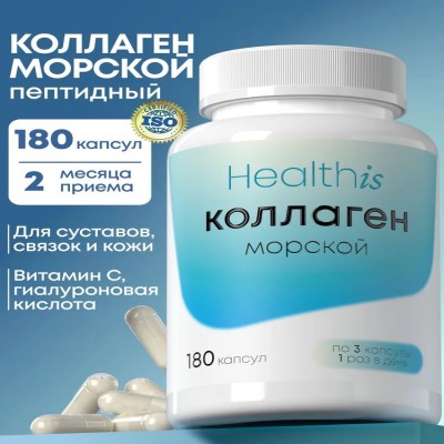 Дозировка 1140 мг коллагена Состав коллаген гидролизованный морской, витамин С, гиалуроновая кислота, тальк пищевой, капсула (желатин пищевой). Способ применения Принимать по 3 капсулы в день во время еды. Показания для укрепления волос, ногтей, улучшения качества волос, прочности костей и эластичность связок