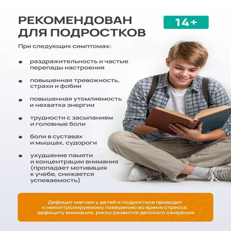 Как принимать? Дозировка: Детям старше 14 лет: 3 капсулы в день. Взрослым: 4 капсулы в день. Начало приёма: Начинайте с 1–2 капсул в день, чтобы организм адаптировался, затем увеличьте дозировку. ⏰ Время: Вечером с ужином или за 1–1,5 часа до сна. Совет: Запивайте достаточным количеством воды. Для лучшего эффекта: Ешьте продукты, богатые магнием (орехи, авокадо, шпинат). Курс: Не менее 1 месяца, при необходимости повторить. Противопоказания: Индивидуальная непереносимость, беременность, кормление грудью. Рекомендация: Проконсультируйтесь с врачом перед приёмом. ️ Хранение: В сухом, защищённом от солнца месте, недоступном для детей, при температуре до 25°C.