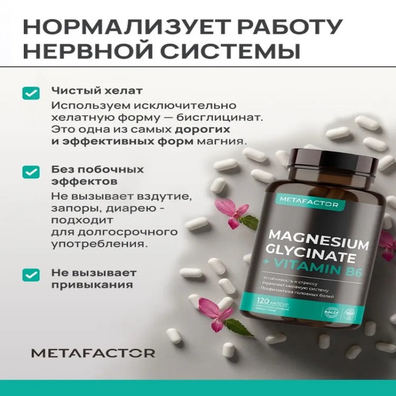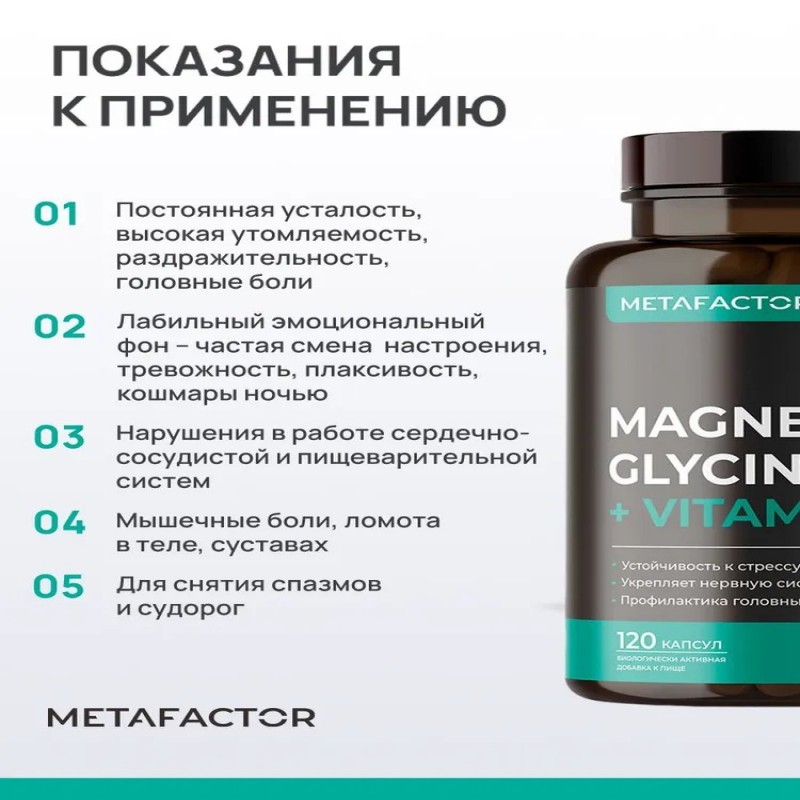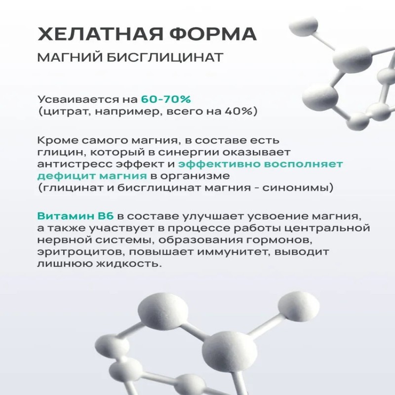 Магний бисглицинат помогает при: Раздражительности и нарушениях сна Нервном тике и дрожании рук Судорогах икроножных мышц и стоп Нарушении концентрации и рассеянности ️ Аритмии Головных болях и мигрени Симптомах ПМС (раздражительность, сонливость, повышенный аппетит) Хронической усталости и депрессии Беспричинном страхе и панических атаках Снижении работоспособности и утомляемости Преимущества продукта ️ Успокаивает нервы: Снижает стресс, тревогу и улучшает сон. Поддерживает мышцы: Уменьшает судороги и спазмы. ️ Здоровье сердца: Регулирует ритм и давление. Улучшает концентрацию: Повышает ясность ума и работоспособность. Мягкая форма: Бисглицинат легко усваивается, не раздражает желудок. Подходит для веганов: Растительная оболочка капсулы, без животных компонентов