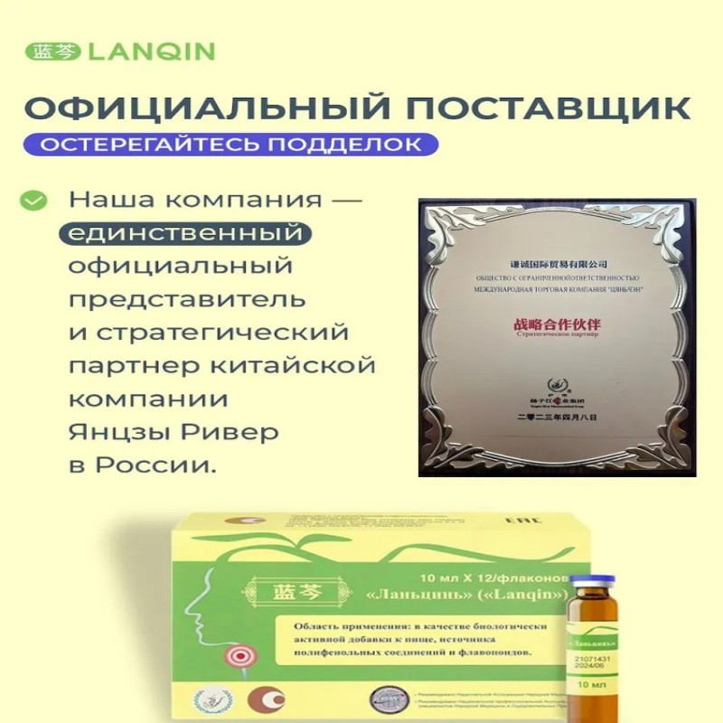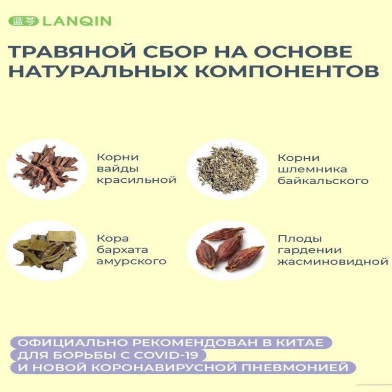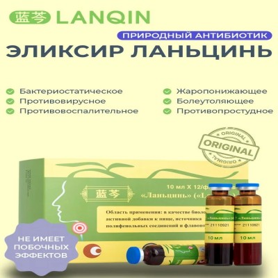 В упаковке 12 флаконов В КНР Ланьцинь включен в «Программу профилактики новой коронавирусной пневмонии методами традиционной китайской медицины». Официально рекомендован в Китае для борьбы с COVID–19, в том числе с осложнениями (когда к вирусу присоединяется бактериальная инфекция).