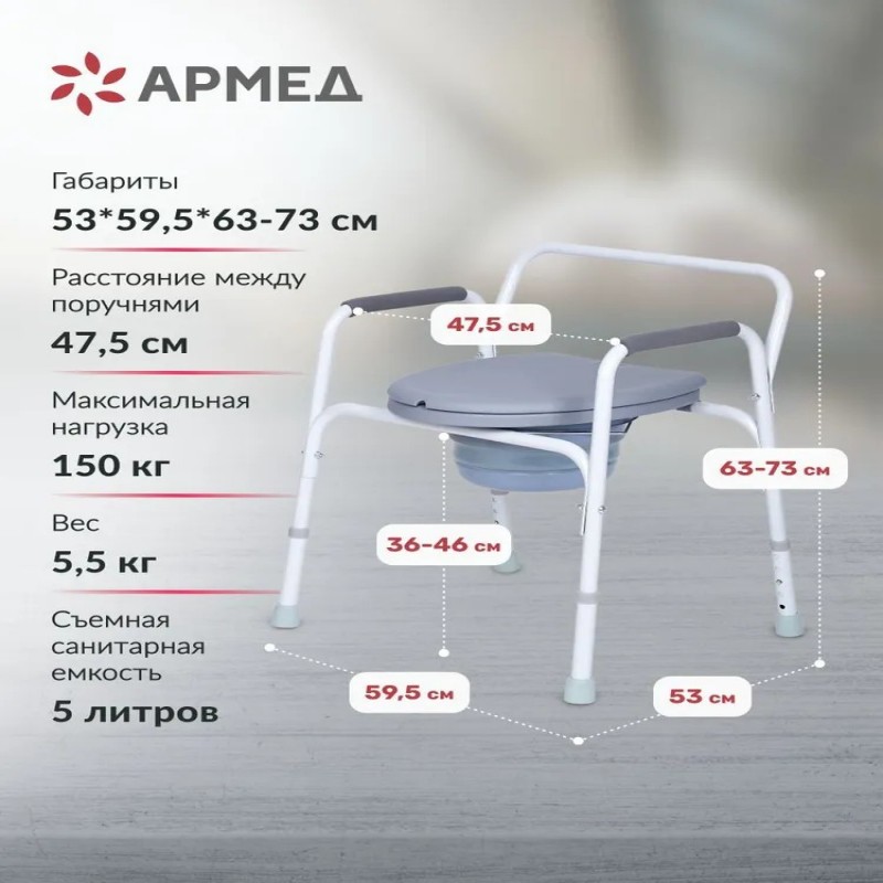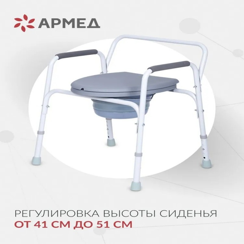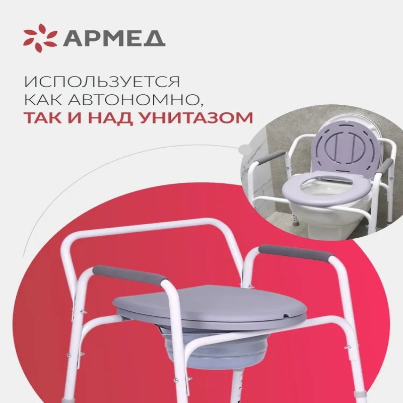 Кресло можно использовать автономно для санитарно-гигиенических нужд, а также путем установки над унитазом. Для устойчивого положения кресла предусмотрены нескользящие резиновые наконечники.