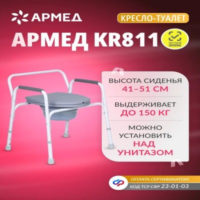 Кресло инвалидное Армед KR811 - функциональная и доступная модель со съемной санитарной емкостью, откидным стульчаком и смягченными подлокотниками. Ширина сиденья подходит для людей средней комплекции, грузоподъемность - 150 кг.
