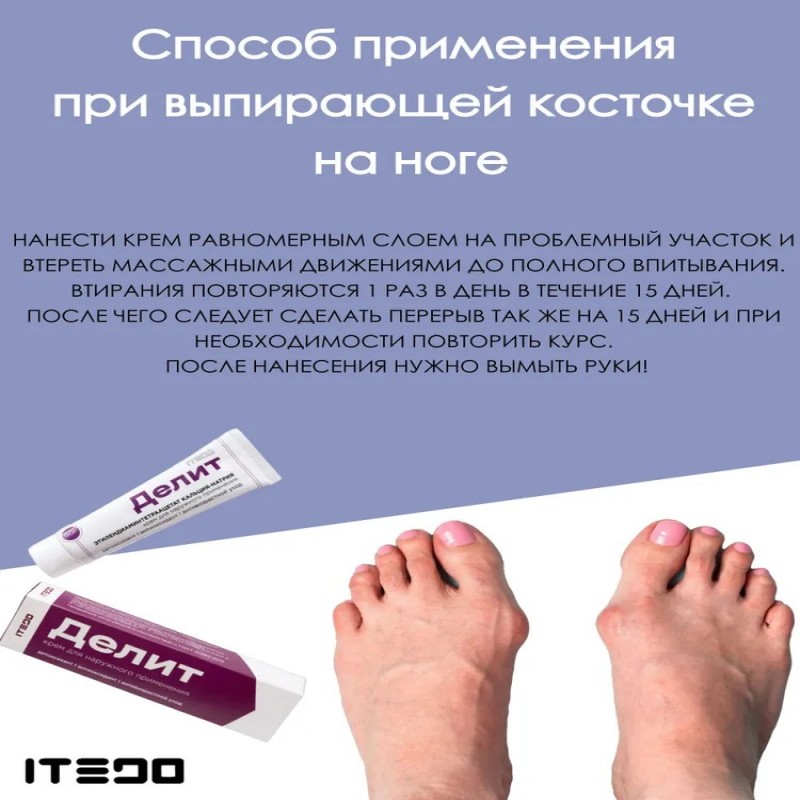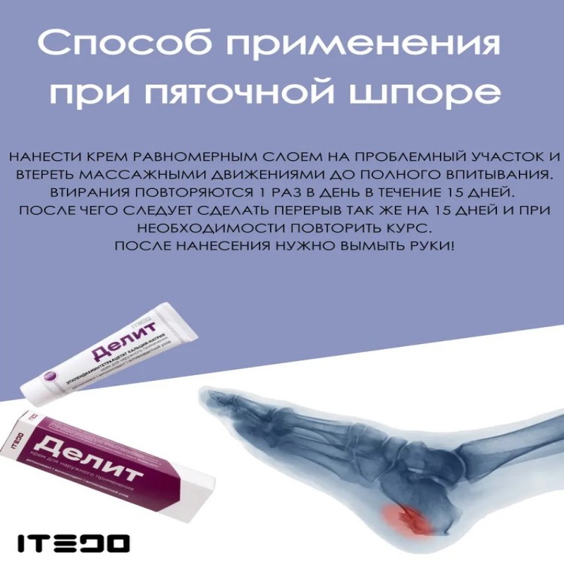 Применение: Нанести крем равномерным слоем на проблемный участок и втереть массажными движениями до полного впитывания 1 раз в день в течение 15 дней. После чего следует сделать перерыв так же на 15 дней и при необходимости повторить курс.