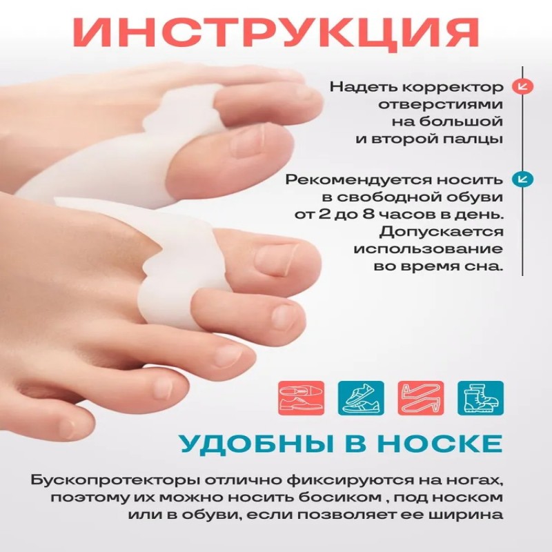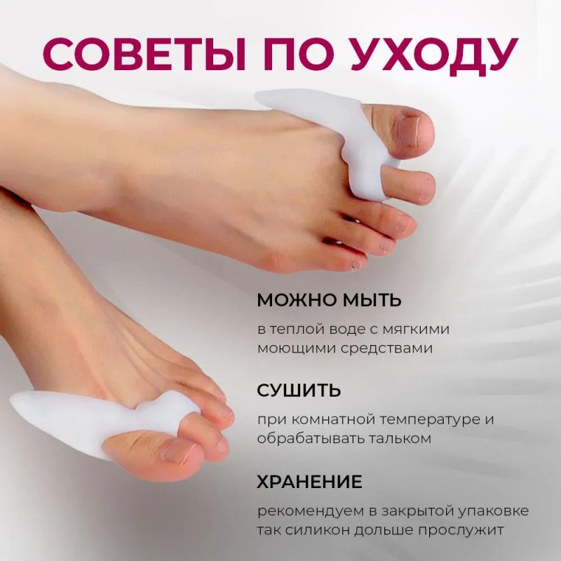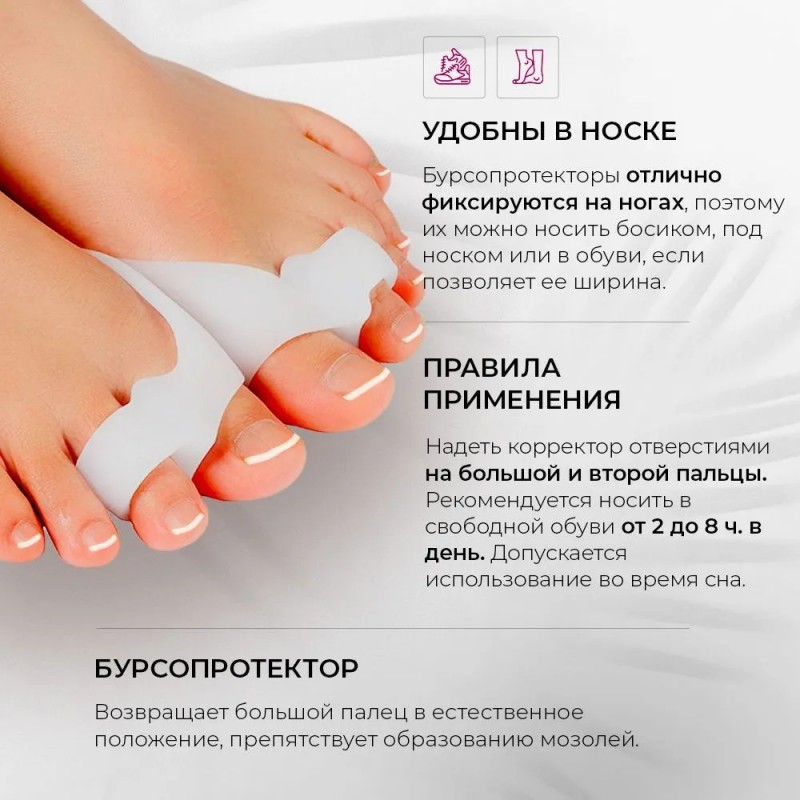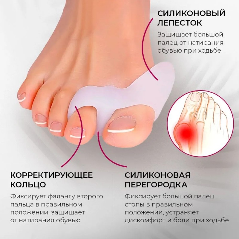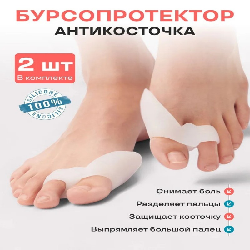 Решить сразу три проблемы? Легко! Эти бурсопротекторы с разделителем эффективны, если у вас есть косточка на суставах больших пальцев ног, второй палец молоткообразный, и к тому же, если эти два пальца перекрещиваются между собой. Бурсопротекторы на большой палец имеют 2 кольца: большое - для фиксации на первом пальце, и малое - для фиксации на втором пальце. Изделия отлично тянутся, поэтому не передавливают пальцы и плотно сидят на стопе. Межпальцевый корректор отводит большой палец от второго. При этом силиконовая накладка и специальная подушечка защищает косточку и плюсну от трения и давления в обуви. С первых же дней применения бурсопротектора ослабнут боли под суставом большого пальца, и вам будет более комфортно при ходьбе. Изделие состоит из медицинского силикона, который способствует смягчению и увлажнению кожи. При постоянном использовании у вас пройдут сухие мозоли и натоптыши. Они отлично тянутся, поэтому подходят под любой размер стопы. Для ухода достаточно промыть теплой водой с мылом. Сушить при комнатной температуре. Комплектация: 2 шт (1 пара). Состав: 100% медицинский гель. Размер: универсальный. Внутренний диаметр большого кольца - 2 см, малого - 1,5 см. Длина накладки - 5,5 см, толщина перегородки - 1 см. Разделитель для пальцев ног можно использовать как межпальцевый разделитель, фиксатор большого пальца ноги.