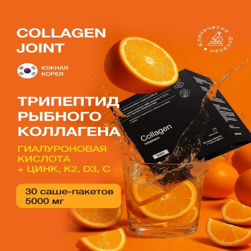 Collagen Joint от Solopharm — это эксклюзивный продукт, созданный для тех, кто заботится о своей красоте, здоровье и молодости. Этот морской коллаген, произведенный из премиального сырья из Южной Кореи, сочетает в себе высокое качество, натуральность и эффективность. Благодаря уникальной формуле, включающей трипептид коллагена, МСМ, витамин С, комплекс цитрусовых биофлавоноидов, витамин К2, цинк, марганец, гиалуроновую кислоту и витамин Д3, этот продукт помогает улучшить состояние кожи, волос, ногтей, а также поддержать здоровье суставов, костей и связок.