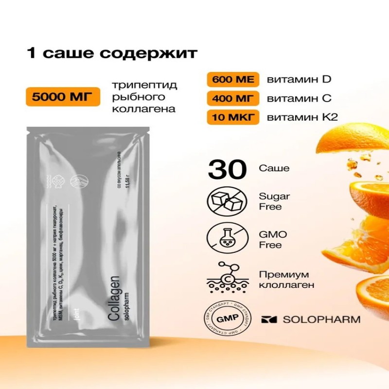 Collagen Joint от Solopharm — это не просто коллаген, а комплексный продукт, который сочетает в себе трипептид коллагена, МСМ, витамин С, комплекс цитрусовых биофлавоноидов, витамин К2, цинк, марганец, гиалуроновую кислоту и витамин Д3. Это идеальный выбор для тех, кто хочет сохранить молодость, красоту и здоровье.
