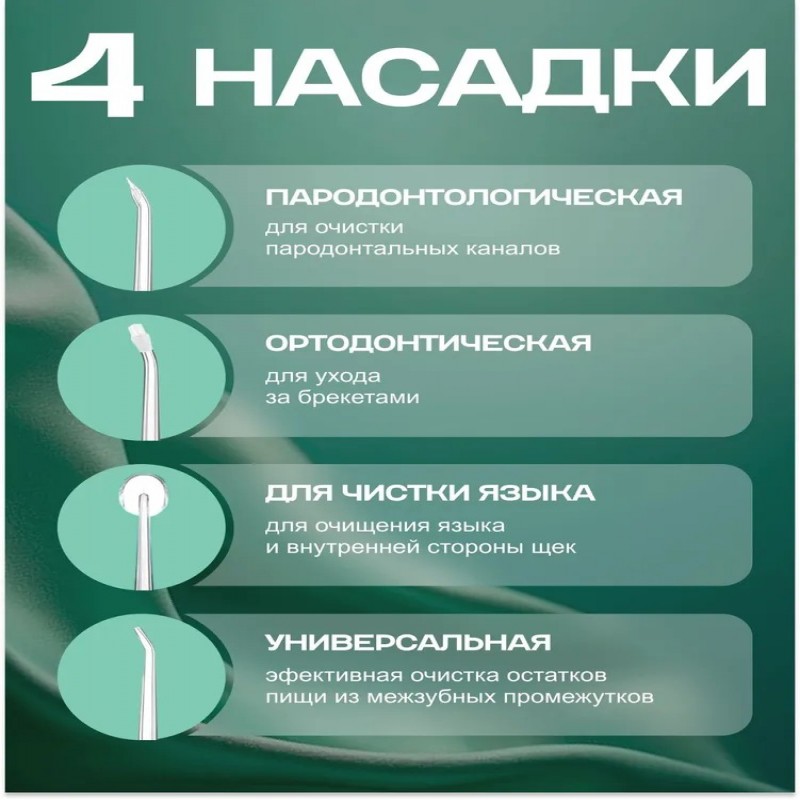 Ирригатор для полости рта с 4 насадками - это уникальное устройство, которое поможет вам поддерживать здоровье полости рта на высшем уровне. Этот портативный ирригатор оснащен четырьмя насадками, которые позволяют удалить остатки пищи и бактерии из труднодоступных мест.