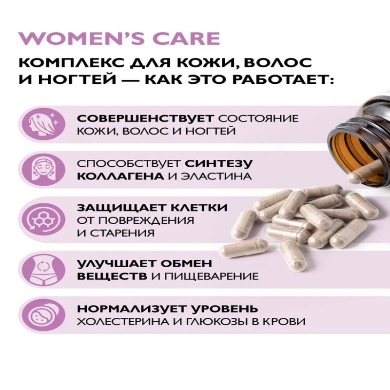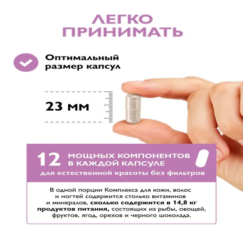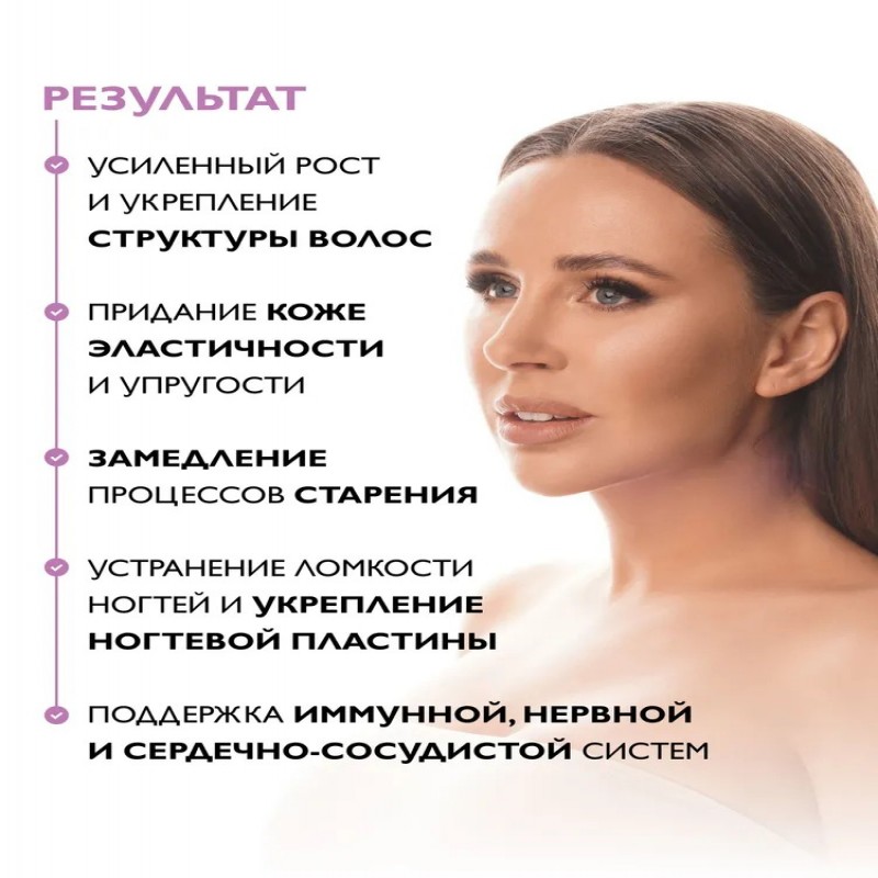 Содержание активных веществ в суточной рекомендуемой дозе (2 капсулы): МСМ - 500 мг, экстракт плодов граната - 150 мг, экстракт красного клевера -100 мг, экстракт дикого ямса -150 мг, астаксантин - 3 мг(150%**), биотин - 5000 мкг (10000%**), цинк - 20 мг (167**), селен -100 мкг (142,8%*), витамин E - 33,4 мг (217%**), витамин C - 150 мг (250%*), медь - 2 мг (200%**), витамин B5 - 40 мг (800%**). *Рекомендуемый уровень суточного потребления согласно ТР ТС 022/2011, Приложение 2. **Адекватный уровень потребления согласно ТС ЕврАзЭС, Глава II, Раздел 1, Приложение 5.