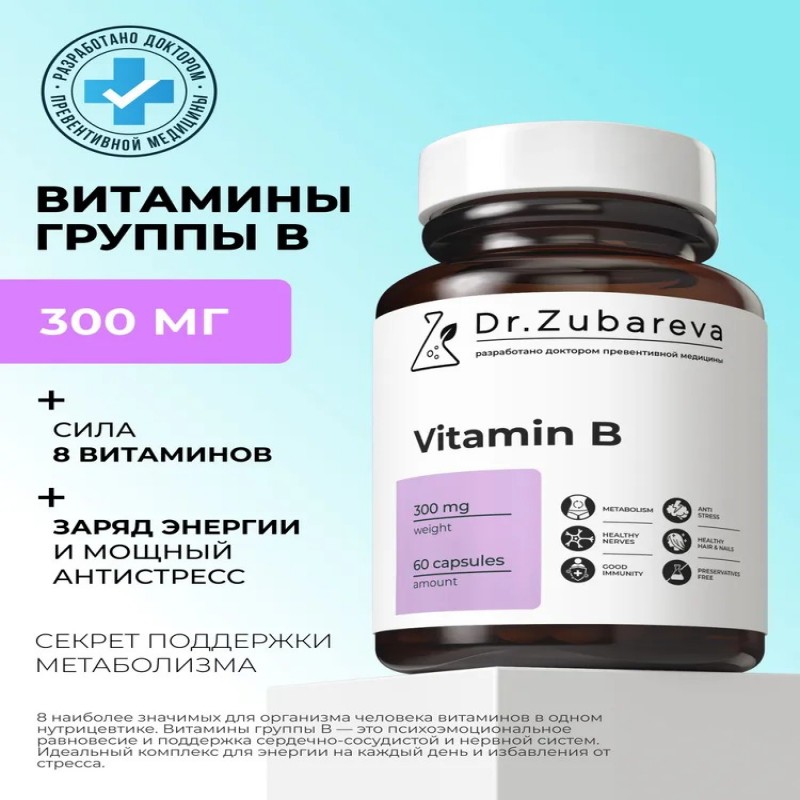 Биологически активная добавка к пище Витамины группы В Сбалансированный препарат от доктора Зубаревой содержит оптимальный комплекс витаминов группы В, С и Е. БАД, который выпускается под брендом Dr. Zubareva, относят к витаминам, отличающимся высокой биодоступностью. Водорастворимые компоненты не накапливаются в организме. Их рекомендуют использовать в качестве дополнительной добавки к пище, которая нормализует жизненно важные функции.