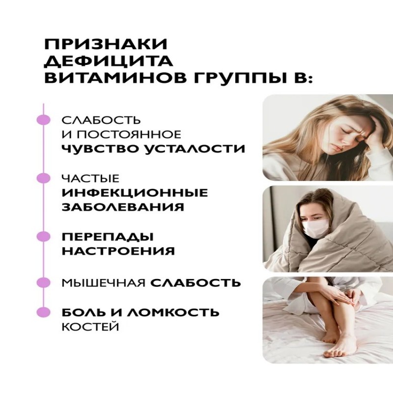 Комплексы витаминов группы B рекомендуются для: 1. Поддержания нормального обмена веществ. 2. Улучшения работы нервной системы. 3. Содействия энергетическому обмену в организме. 4. Поддержания здоровья кожи, волос и ногтей. 5. Участия в синтезе красных кровяных клеток. Однако, перед началом приема, рекомендуется проконсультироваться с врачом, чтобы убедиться, что этот комплекс подходит именно вам и не вызовет нежелательных реакций.