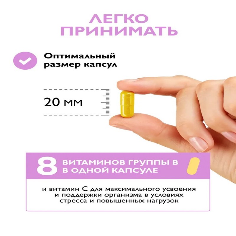 Микрокристаллическая целлюлоза(носитель), гидроксипропилметилцеллюлоза (оболочка капсулы); Дозировка на 2 капсулы: Витамин С (аскорбиновая кислота) - 80 мг Витамин В1 (тиамин) - 10 мг Витамин В3 (ниацин) - 100 мг Витамин В6 (пиридоксина гидрохлорид) -12мг Витамин В9 ( L-метилфолат кальция) - 800 мкг Витамин В12 (метилкобаламин) - 18 мкг Витамин В7 (биотин) - 300 мкг Витамин В5 (пантотеновая кислота) - 30 мг