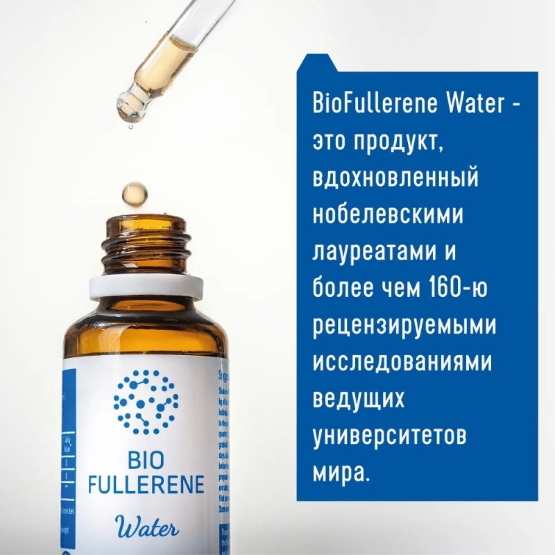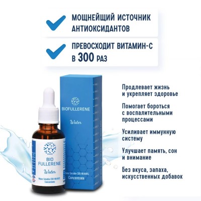 Важнейшим фундаментальным свойством фуллерена С60, который является основным активным компонентом BioFullerene Water, является его антиоксидантная активность. Она во много десятков раз эффективнее широко используемых в медицине антиоксидантов и согласно исследованиям, превосходит витамин С более чем в 300 раз. Как «радикальная ловушка», одной своей молекулой фуллерен может нейтрализовать более 20 свободных радикалов кислорода. Свободные радикалы — это неспаренные молекулы кислорода (синглетный кислород), которые возникают в организме человека от негативного внешнего воздействия, например: курения, стресса, неправильного питания и т.д. Именно они являются основной причиной образования и развития воспалительных процессов и множества возраст-зависимых заболеваний в организме.
