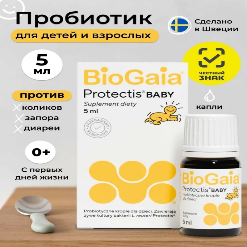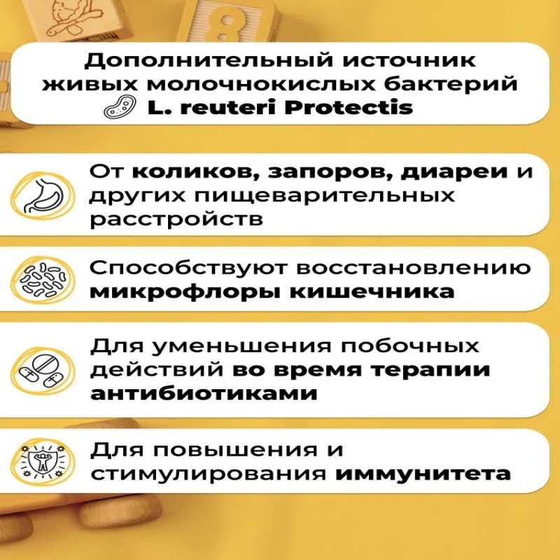 5 капель содержат активные вещества: Lactobacillusreuteri DSM 17938 (L. reuteriProtectis) 108 КОЕ (100 млн жизнеспособных бактерий); Сахароза 0,005 г. вспомогательные вещества: Носители – масло подсолнечное; Триглицериды каприловые; Агент антислеживающий – кремния диоксид (Е 551). Около 10% культуральной смеси Lactobacillusreuteri DSM 17938 состоит из моно- и дисахаридов, 5% из которых приходится на сахарозу.