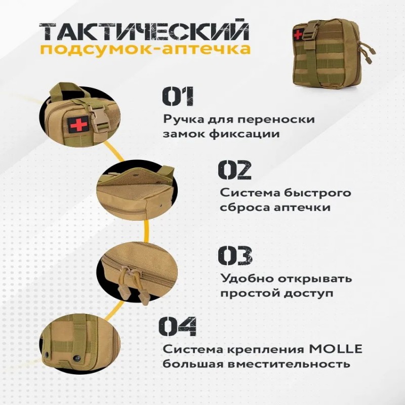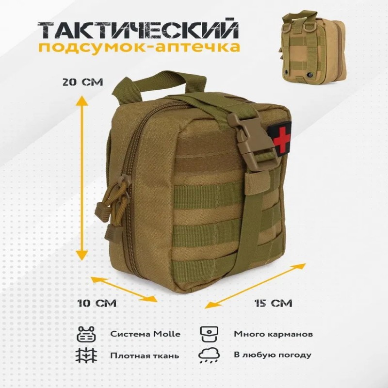Подсумок содержит все необходимое для оказания первой помощи при ранениях и травмах. Очень крепкая медицинская сумка прослужит не один год даже при жесткой эксплуатации в полевых условиях. Отличное качество изготовления, прочные материалы, удобное расположение отсеков и приличная вместительность. Швы сделаны хорошо, нитки не торчат, заклёпки приделаны аккуратно и ровно. Внутренние дополнительные отсеки для хранения денег, документов, карт, ножей, фонарей и прочих важных аксессуаров. Высококачественный материал и прочная двойная строчка усиливают водонепроницаемость и стойкость к гниению даже при постоянном использовании во влажной среде. Плотные эластичные ремни и пряжки делают использование аптечки максимально удобным.