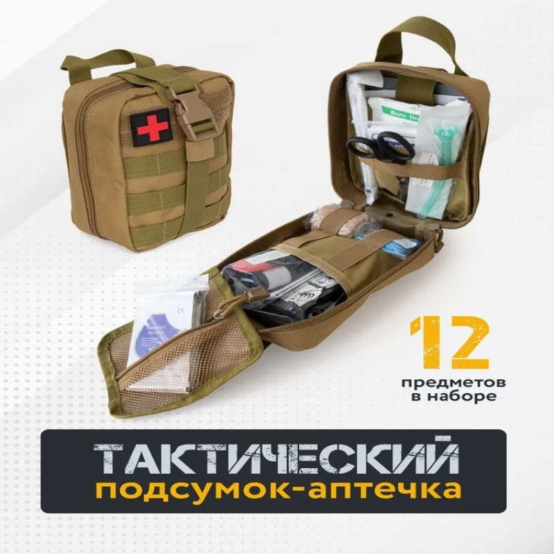 В комплект входят: подсумок отрывной для хранения лекарств; турникет кровоостанавливающий; бинт эластичный 7,5х4,5 см; бандаж израильский (ИПП) 6 дюймов (15 см); лейкопластырь; окклюзионная повязка для раны; термоодеяло 160х210 см; противоожоговый гель 3,5 г; ножницы тактические атравматичные; перчатки нитриловые. специальная мини аптечка отрывная с наполнением дорожная походная в машину, находящаяся на снаряжении каждого профессионального бойца, позволяет спасти жизнь в первые секунды после ранения.