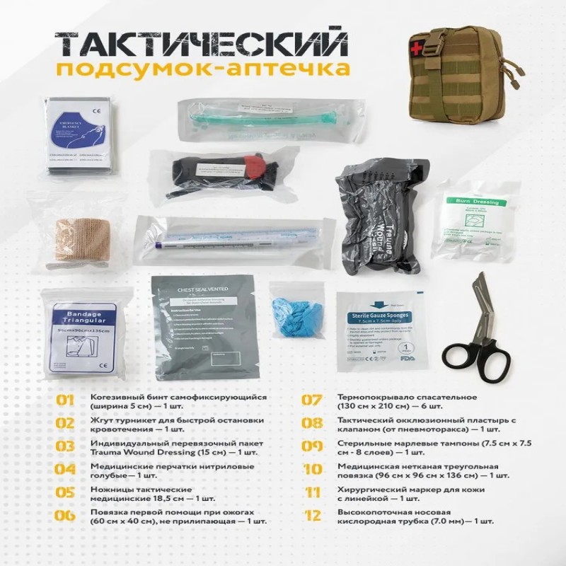 Когезивный бинт самофиксирующийся (ширина 5 см) — 1 шт., Жгут турникет для быстрой остановки кровотечения — 1 шт., Индивидуальный перевязочный пакет Trauma Wound Dressing (15 см) — 1 шт., Медицинские перчатки нитриловые голубые— 1 шт., Ножницы тактические медицинские 18,5 см — 1 шт., Повязка первой помощи при ожогах (60 см x 40 см), не прилипающая — 1 шт., Термопокрывало спасательное (130 см х 210 см) — 1 шт., Тактический окклюзионный пластырь с клапаном (от пневмоторакса) — 1 шт., Стерильные марлевые тампоны (7.5 см х 7.5 см - 8 слоев) — 1 шт., Медицинская нетканая треугольная повязка (96 см х 96 см х 136 см) — 1 шт., Хирургический маркер для кожи с линейкой — 1 шт., Высокопоточная носовая кислородная трубка (7.0 мм)— 1 шт.