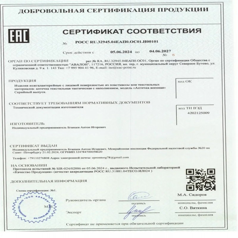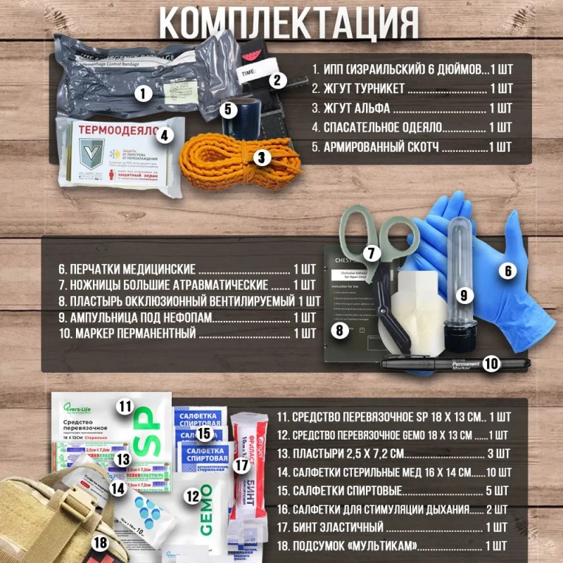 Комплектация1. ИПП 6 дюймов – 1 шт.; 2. Турникет – 1 шт.; 3. Ножницы большие – 1 шт.; 4. Маркер – 1 шт.; 5. Перчатки (обычные)– 1 шт.; 6. Одеяло – 1 шт.; 7. Окклюзионный пластырь – 1 шт.; 8. Противоожоговые салфетки СП (большие) – 1 шт.; 9. Кровоостанавливающее средство ГЕМО (большие) – 1 шт.; 10. Салфетки для стимуляции дыхания – 2 шт.; 11. Салфетки спиртовые – 5 шт.; 12. Пластырь – 3 шт.; 13. Армированный скотч – 1 шт.; 14. Подсумок Черный – 1 шт.; 15. Жгут Альфа - 1 шт.; 16. Эластичный бинт (фри ласт или дешевле) - 1 шт.; 17. Салфетки (упаковка 10 штук) - 1 шт.; 18. Таблетница под нефопам - 1 шт.;