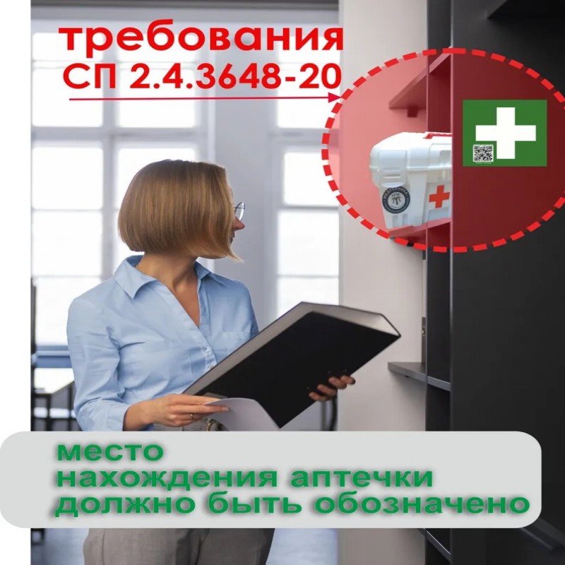 По требованиям СанПин место нахождения аптечки указывается белым крестом на зеленом фоне.