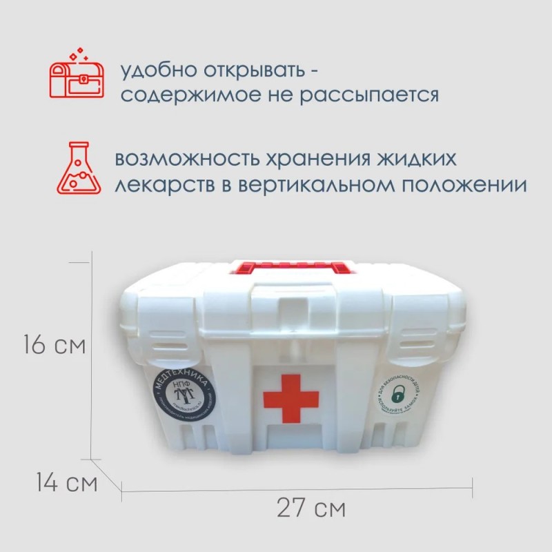 Удобно открывать - содержимое не рассыпается. Аптечку можно дополнить медикаментами, данный футляр предоставляет возможность хранения жидких лекарств в вертикальном положении.