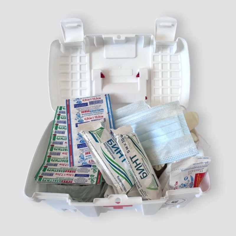 Мы снабдили аптечку бинтами высокой плотности( 36 г/м2), профессиональными ножницами для разрезания повязок по Листеру и медицинскими перчатками повышенной прочности.
