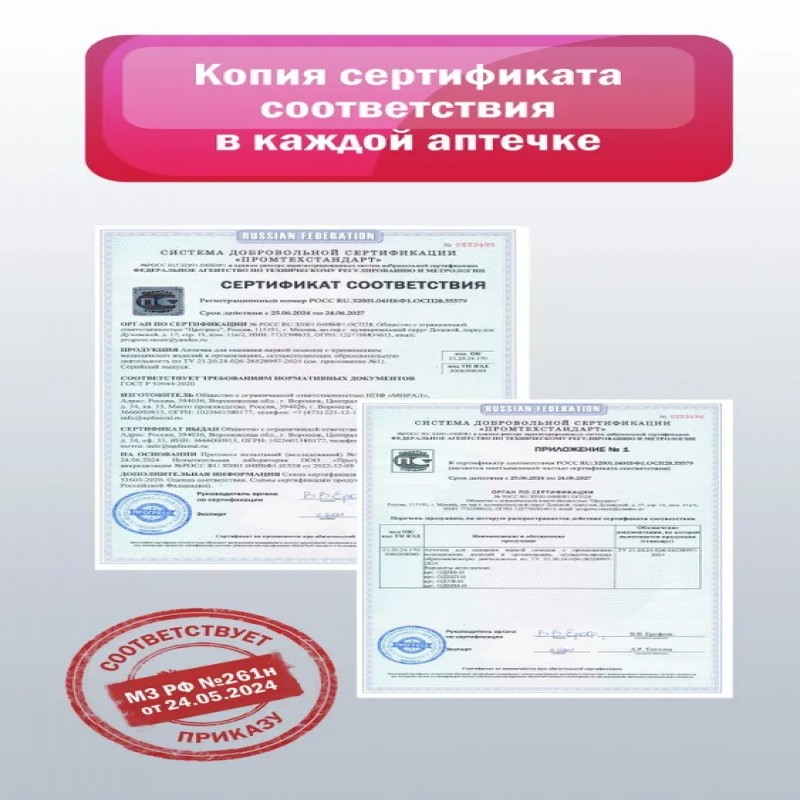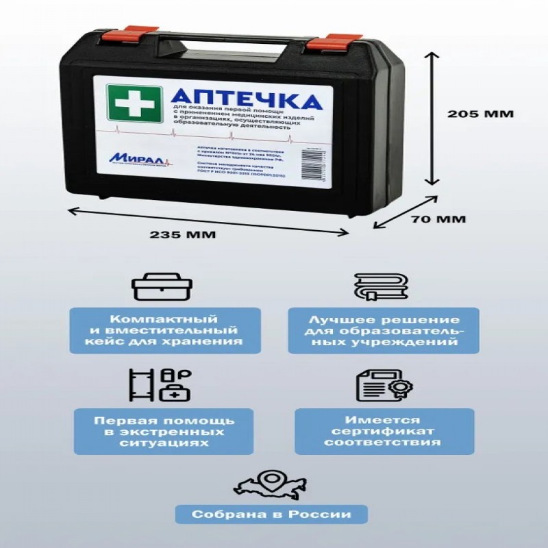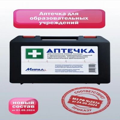 Аптечка для оказания первой помощи с применением медицинских изделий в организациях осуществляющих образовательную деятельность соответствует требованиям Приказа Министерства здравоохранения РФ от 24.05.2024г.№261н. Аптечка для первой помощи, разработанная для образовательных учреждений МИРАЛ, представляет собой идеальное решение как для бытового, так и для выездного применения. Удобный пластиковый футляр позволяет легко переносить аптечку и хранить её в доступном месте. Сертификация по стандартам ГОСТ 2024 гарантирует надёжность и качество содержимого, что особенно важно в экстренных ситуациях. Каждый комплект включает в себя тщательно отобранные медицинские принадлежности, обеспечивающие оказание первой помощи. Кроме того, данный кейс можно легко пополнить по мере необходимости, что позволяет адаптировать его содержимое под индивидуальные потребности или специфические условия. Удобство и многофункциональность делают аптечку незаменимым помощником в любой ситуации. Имеется Сертификат соответствия (действует до 24.06.2027г.).
