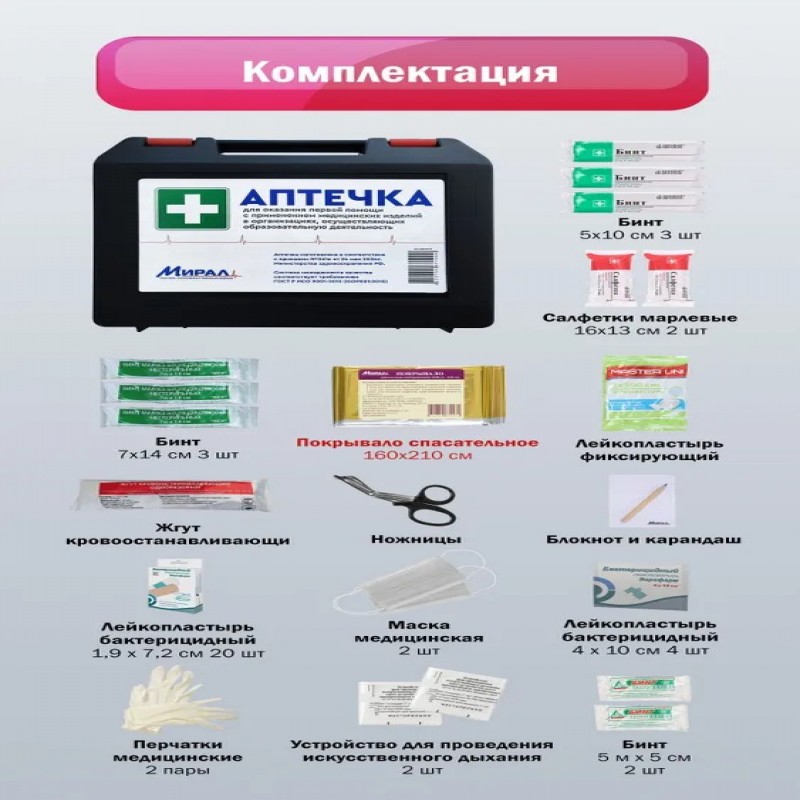 1 Медицинские изделия: 1.1 Маска медицинская нестерильная одноразовая-2 шт. 1.2 Перчатки медицинские нестерильные, размером не менее М-2 пары 1.3 Устройство для проведения искусственного дыхания «Рот-Устройство-Рот»-2 шт. 1.4 Жгут кровоостанавливающий для остановки артериального кровотечения-1 шт. 1.5 Бинт марлевый медицинский размером не менее 5 м х 5 см или бинт фиксирующий эластичный нестерильный размером 2 м х 5 см-2 шт. 1.6 Бинт марлевый медицинский размером не менее 5 м х 10 см или бинт фиксирующий эластичный нестерильный размером 2 м х 10 см-3 шт. 1.7 Бинт марлевый медицинский размером не менее 7 м х 14 см или бинт фиксирующий эластичный нестерильный размером 2 м х 14 см-3 шт. 1.8 Салфетки марлевые медицинские стерильные размером не менее 16 х 13 см № 10-2 упак. 1.9 Лейкопластырь фиксирующий рулонный размером не менее 2 х 500 см-1 шт. 1.10 Лейкопластырь бактерицидный размером не менее 1,9 х 7,2 см-20 шт. 1.11 Лейкопластырь бактерицидный размером не менее 4 х 10 см -4 шт. 1.12 Покрывало спасательное изотермическое размером не менее 160 х 210 см-1 шт. 1.13 Ножницы для разрезания перевязочного материала и ткани-1 шт. 2 Прочие средства 2.1 Инструкция по оказанию первой помощи с использованием аптечки для оказания первой помощи с применением медицинских изделий в организациях осуществляющих образовательную деятельность-1 шт. 2.2 Блокнот формата не менее А7-1шт 2.3 Маркер черный (синий) или карандаш-1шт 2.4 Футляр или сумка-1 шт.