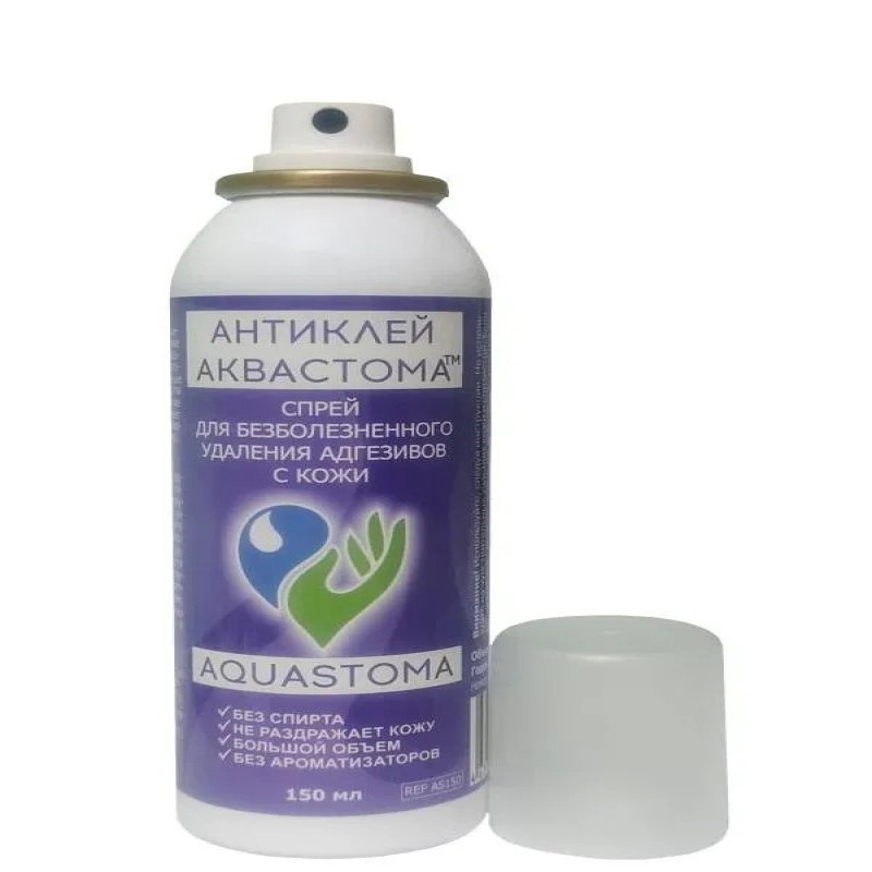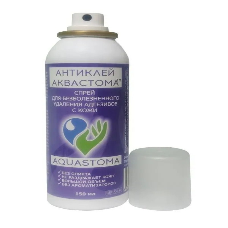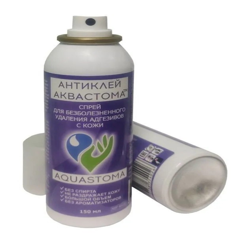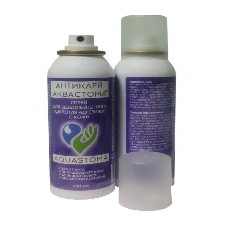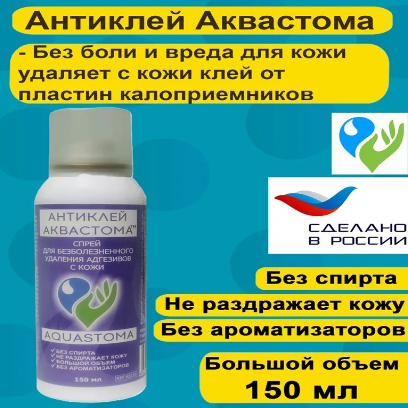 Частая смена клеящих составов, тейпов, лент и других средств приводит к возникновению адгезивных травм и неприятных ощущений на коже, таких как покраснение, раздражение, сухость. Адгезивные травмы можно предотвратить используя антиклей. После нанесения спрея клей мгновенно растворяется и адгезивную основу, безболезненно и без кожных повреждений снимаются, не травмируя кожу. Средство Аквастома Антиклей™ быстро высыхает и не препятствует наклеиванию новых калоприемников, не вызывает аллергии, безопасен для кожи, не содержит парфюмированных отдушек, не имеет масляной основы, не содержит спирт.