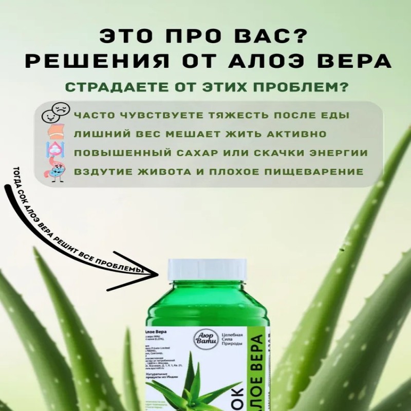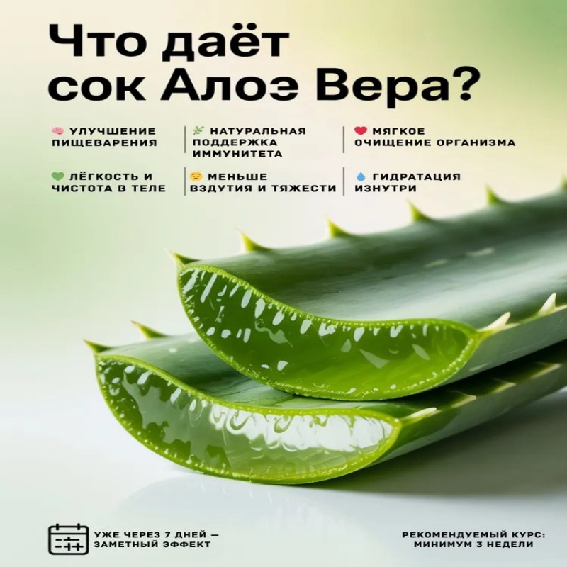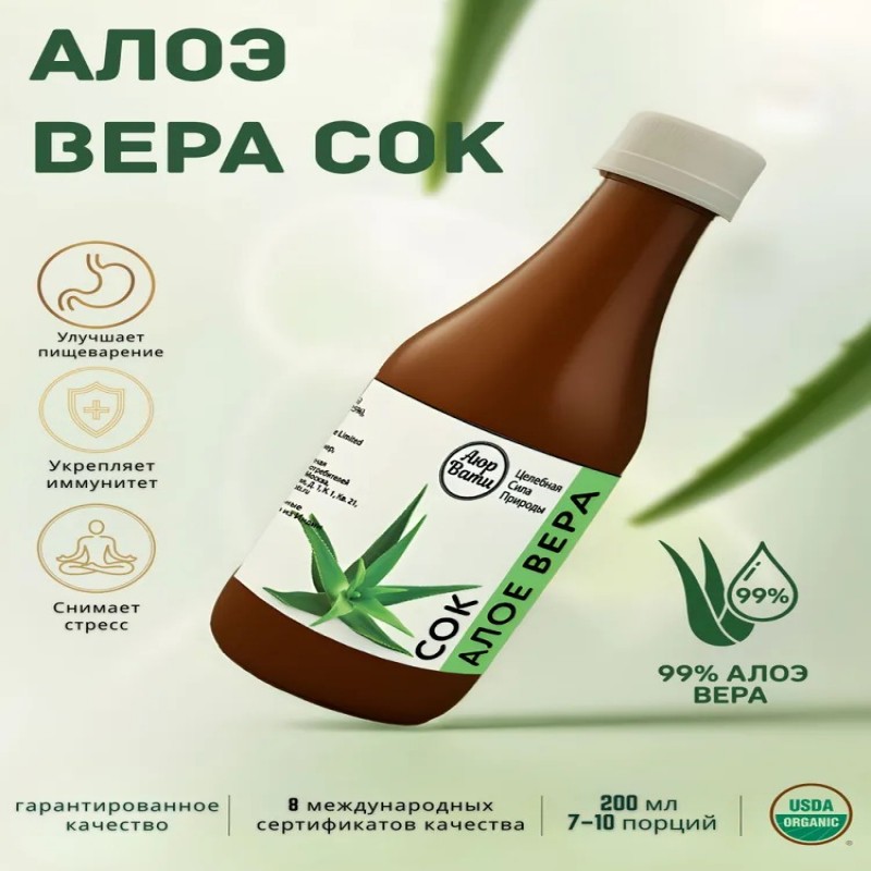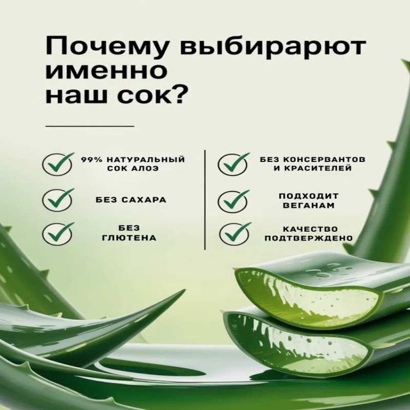 Наш сок алоэ вера — это натуральный напиток для здоровья, созданный из 100% настоящего алоэ вера. С минимальным содержанием консервантов и без искусственных добавок, он сохраняет подлинный вкус, аромат и полезные свойства свежего алоэ вера. Богатый витаминами, минералами и антиоксидантами, этот сок помогает улучшить пищеварение, укрепить иммунитет и способствует здоровью кожи и волос.