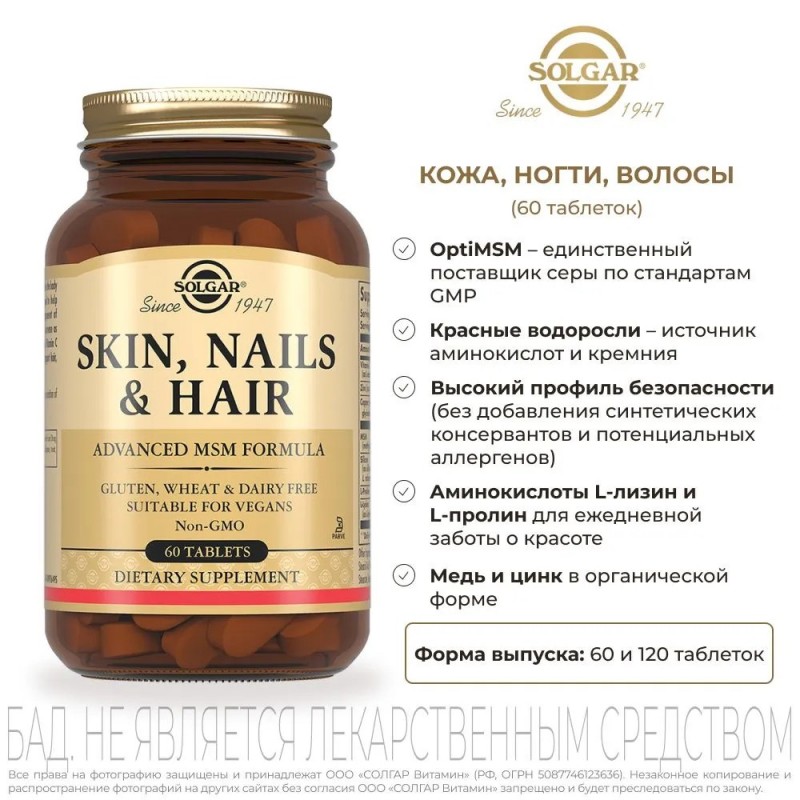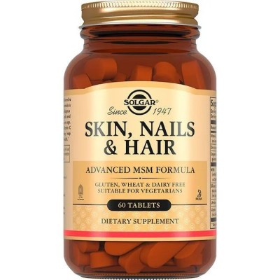 Таблетки «Кожа, ногти, волосы» рекомендуется в качестве дополнительного источника серы, витамина С, цинка и меди. Основу комплекса «Кожа, ногти, волосы» составляет МСМ (метилсульфонилметан) – источник органической серы, основной компонент кератина (строительный элемент волос и ногтей), а также коллагена (основа кожи). Сбалансированный состав позволяет сохранить упругость и эластичность кожи, защитить от пагубного воздействия УФ-лучей, а также регулировать деятельность сальных желез, укреплять волосы и ногти.