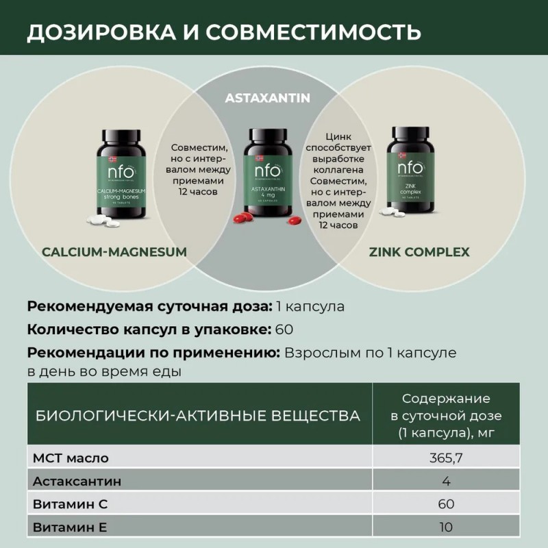 триглицериды средней цепи, оболочка капсулы (желатин, глицерин), аскорбиновая кислота, астаксантин, Д-альфа- токоферол ацетат, пчелиный воск E901 (глазирователь), диоксид кремния E551 (антислеживающий агент).