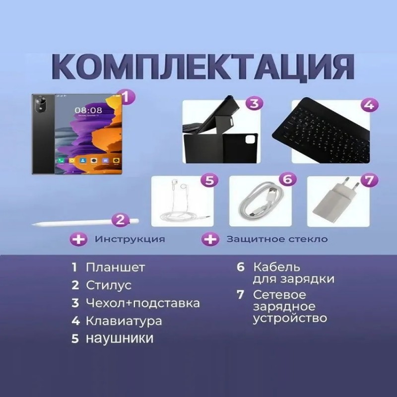 КомплектацияЗакаленная пленка Емкостное перо Подставка для планшета Зарядное устройство Кабель для передачи данных Кабель для наушников