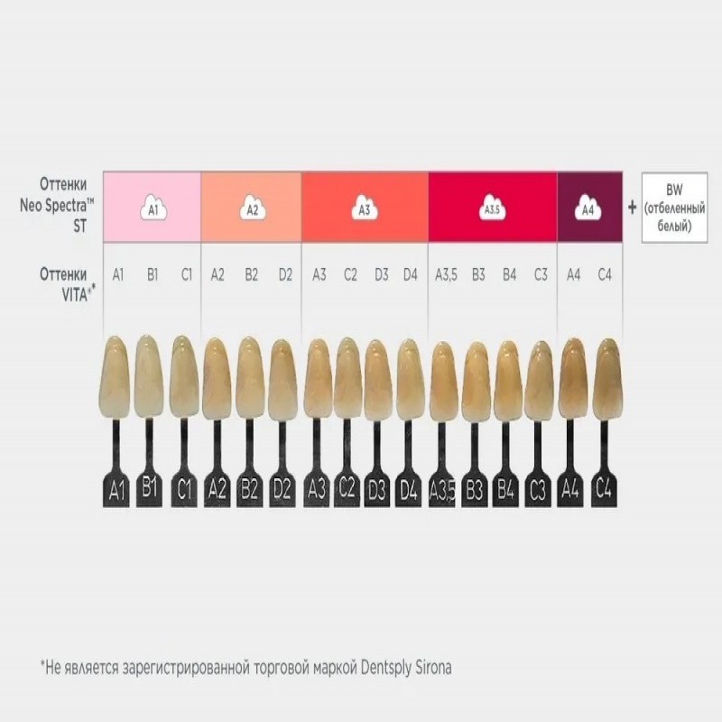 Материал стоматологический светоотверждаемый реставрационный NEO Spectra ST для реставрации передних и боковых зубов в отдельных упаковках.