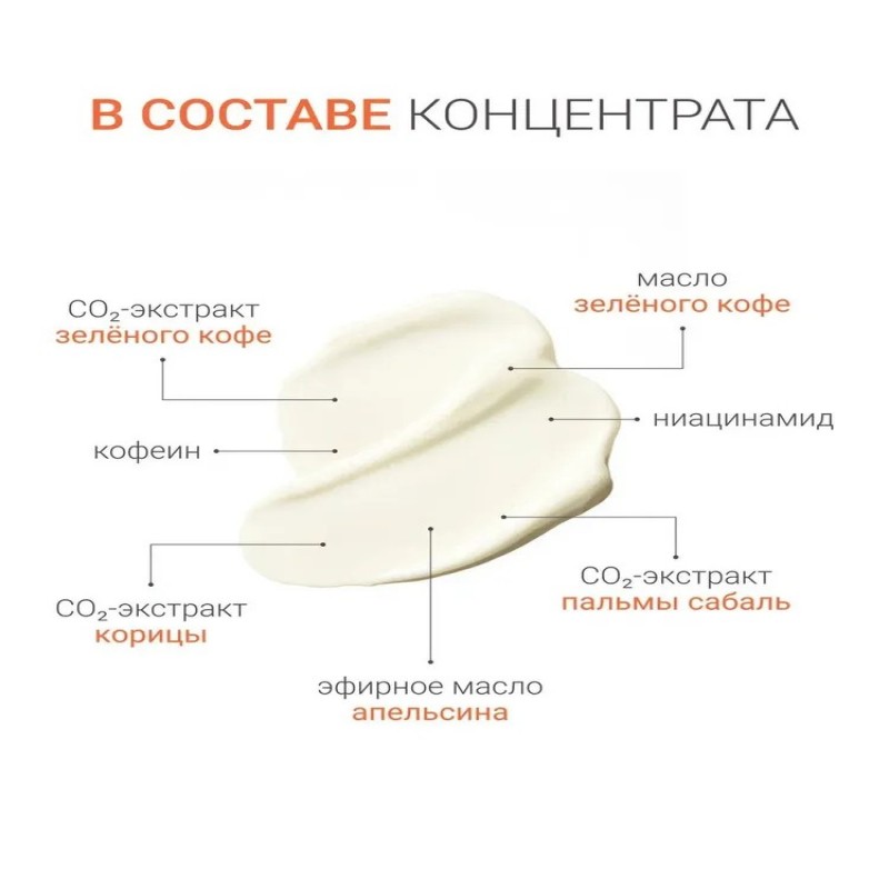 Cinnamomum Zeylanicum Bark Water, Caffeine, Niacinamide, Sucrose Stearate, Serenoa Serrulata Fruit Extract, Coffea Arabica (Green Coffee) Seed Extract, Cinnamomum Cassia Bark Extract, Dimethyl Isosorbide, Glycerin, Water (Aqua), Sucrose Laurate, Coffea Arabica (Green Coffee) Seed Oil, Coffea Arabica Seed Oil, Citrus Aurantium Dulcis Oil/Citrus Sinensis Oil, Prunus Persica Kernel Oil, Hippophae Rhamnodes Fruit Oil, Carbomer, Lecithin, L-Arginine, Myrtys Communis Leaf Oil, Eucalyptus Globulus Leaf Oil, Ethylhexylglycerin, Phenoxyethanol, Sodium Hydroxide. Условия хранения и сроки годности Срок годности — 18 мес, после вскрытия — 4 мес. Хранить в сухом тёмном месте при температуре от 0 °C до +25 °C.