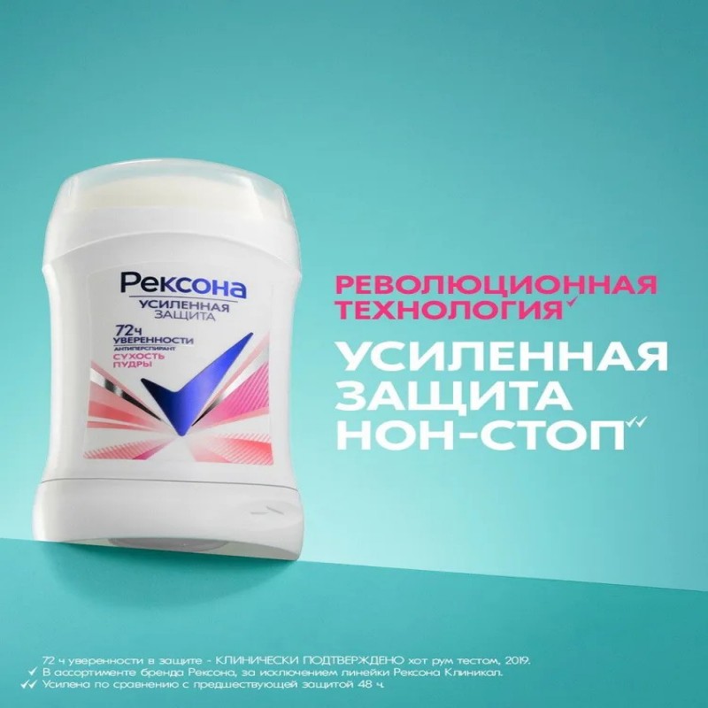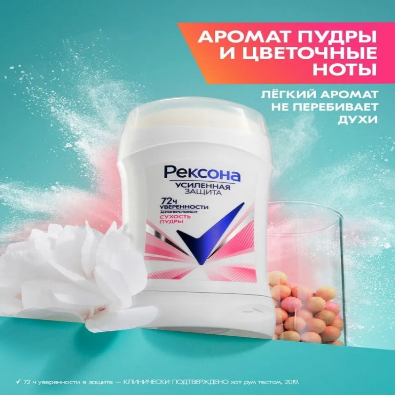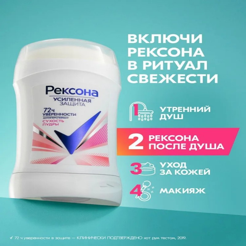 Дезодорант стик Рексона Сухость пудры – это средство для личной гигиены, которое предоставляет коже подмышек оптимальный уход. Освежающий дезодорант карандаш обеспечивает эффективное устранение запаха и пота на 72 часа*. Антиперспирант женский стик разработан на основе технологии со специальными микрочастицами – это запатентованная усиленная формула, созданная специально для бренда Рексона. Революционная технология со специальными микрочастицами активируется при движении, сохраняя свежесть в течение всего дня. Дезодорант антиперспирант женский против неприятного запаха пота содержит особые** микрокапсулы с ароматом, которые раскрываются при каждом движении’. Уходовый дезик не требует повторного нанесения в течение дня. Дезодорант женский твердый имеет приятный аромат. Нежный пудровый запах понравится каждой женщине. Твердый дезодорант-антиперспирант Рексона Сухость пудры – это ваша надежная защита от запаха и пота на 72 часа*. Антиперспирант женский твердый дерматологически протестирован и подходит для ежедневного использования. Уходовая косметика для кожи от бренда Рексона – это практичный подарок для девушек и женщин на любой праздник и просто так, без повода. Объем – 40 мл. Формат выпуска средства – стик, карандаш. Продукция бренда Рексона — это эффективная защита, привлекательная упаковка, доступная цена и разнообразие ароматов. Рексона никогда не подведет! *72 ч уверенности в защите – КЛИНИЧЕСКИ ПОДТВЕРЖДЕНО хот рум тестом, 2019. **в портфеле бренда Рексона. ’средство реагирует (микрокапсулы раскрываются) на каждое твое движение, сопровождаемое трением руки о тело в зоне подмышки.