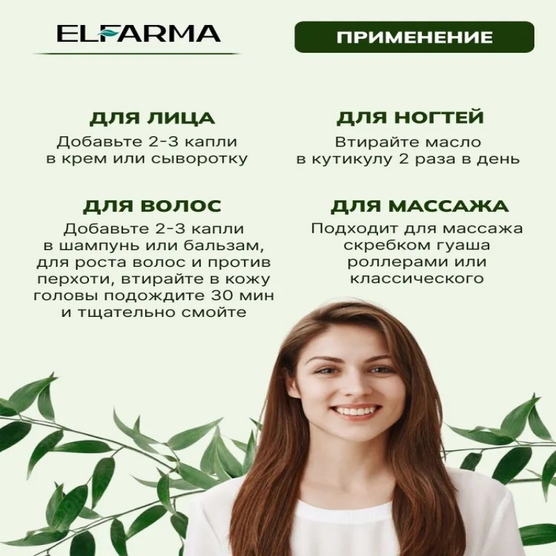 Масло чайного дерева также идеально подходит для ухода за волосами. Наносите его на кожу головы как средство для стимуляции роста, а также для уменьшения перхоти, благодаря своим антисептическим свойствам. В результате волосы станут более крепкими, а кожа головы — здоровой и сбалансированной.