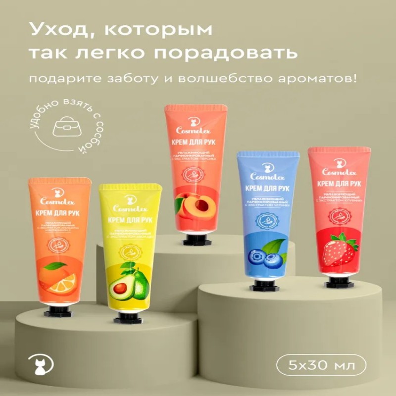 Подарочный набор кремов для рук — идеальный выбор в качестве подарка на любой праздник. В нашем наборе 5 штук мини кремов по 30 гр, каждый из которых обладает неповторимым ароматом(черника, клубника, авокадо, персик, апельсин) и изготовлен из экологически чистых компонентов.