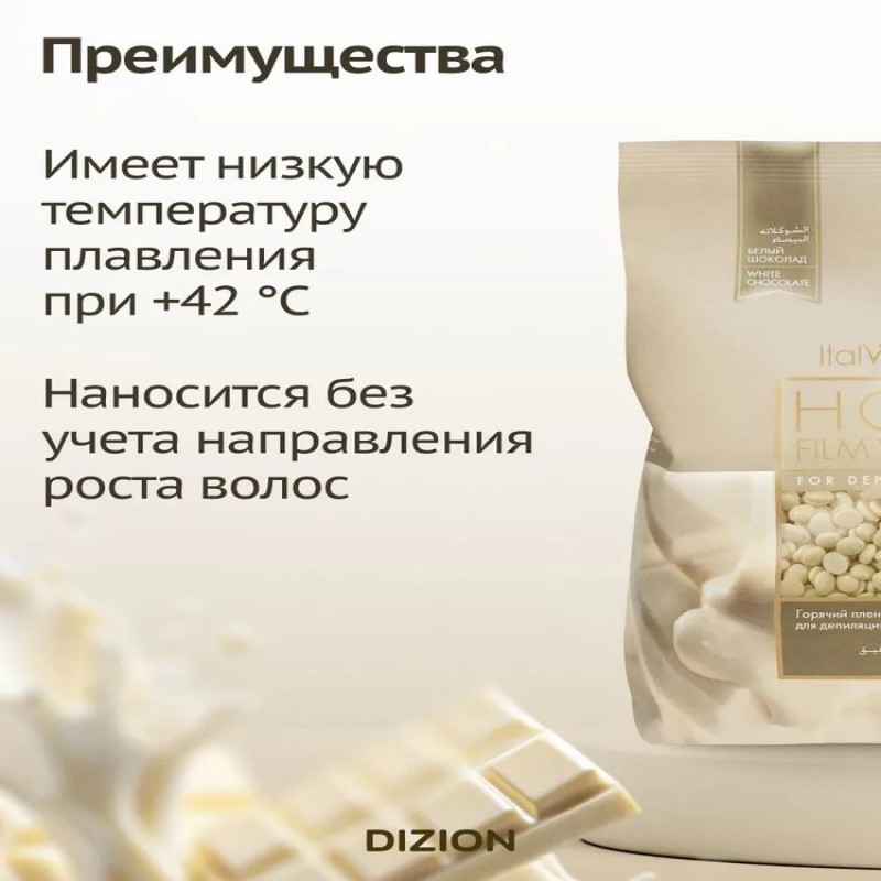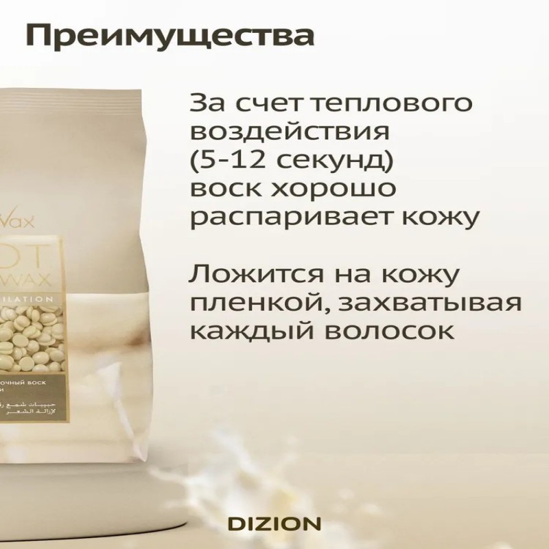 Воск имеет низкую температуру плавления (До 45 градосов) и рабочую температуру (42 градуса). Это делает депиляцию безопасной. Такая низкая температура гарантирует, что вы не получите ожог, а воск не пристанет к коже. Воск пленочный и обволакивает каждый волосок. Что позволяет легче их удалять.