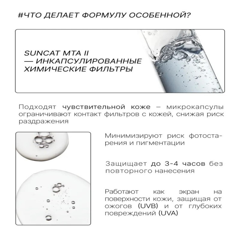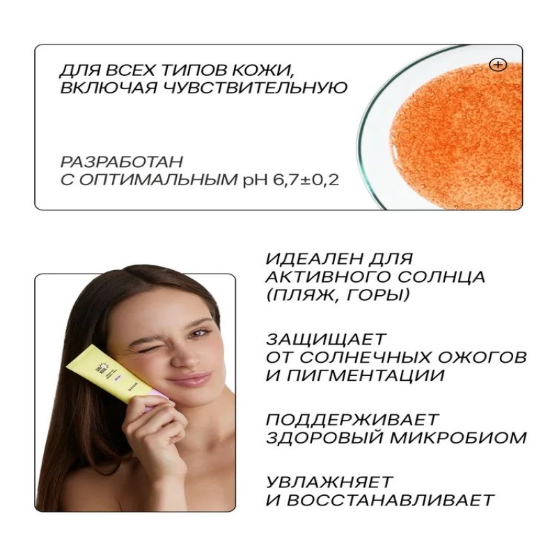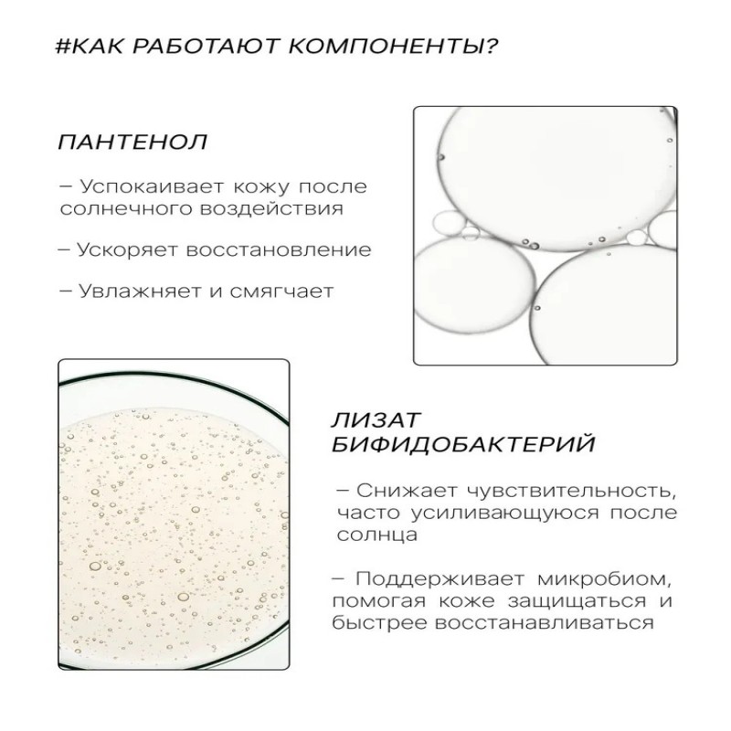 Пантенол и лизат бифидобактерий успокаивают кожу после солнца, уменьшают чувствительность, ускоряют регенерацию, увлажняют и поддерживают микробиом.