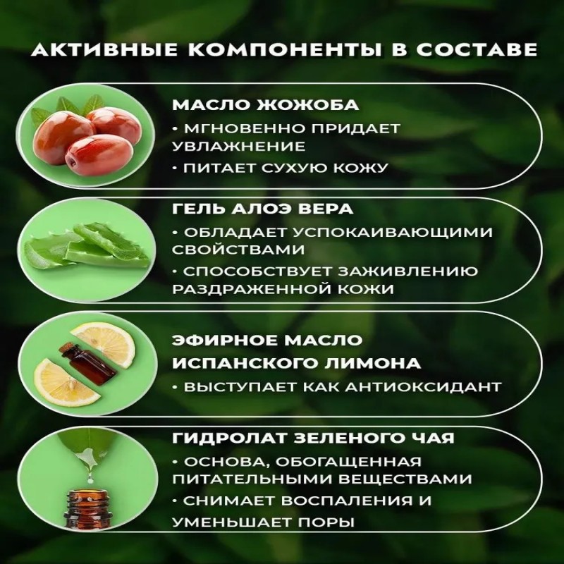 Природная вода Мацеста, гидролат зеленого чая, масло виноградных косточек, масло рисовых отрубей, лецитин (растительный), масло жожоба, оксид цинка, гель алоэ вера, растительный глицерин, Д-пантенол, витамин C, экстракт каштана, гинкго билоба, экстракт ванили, эфирное масло испанского лимона, шаромикс 708* *- натуральный консервант