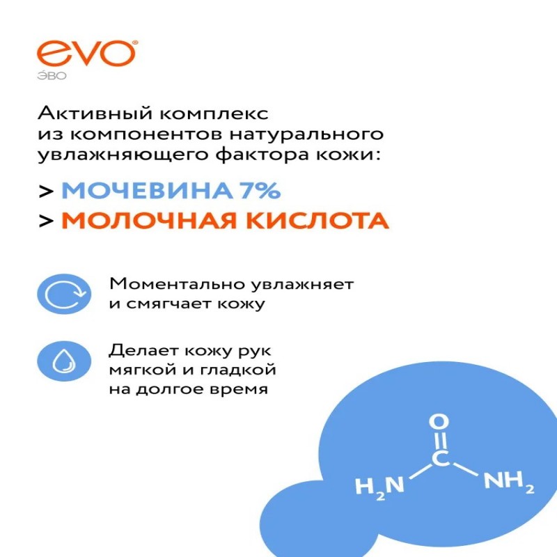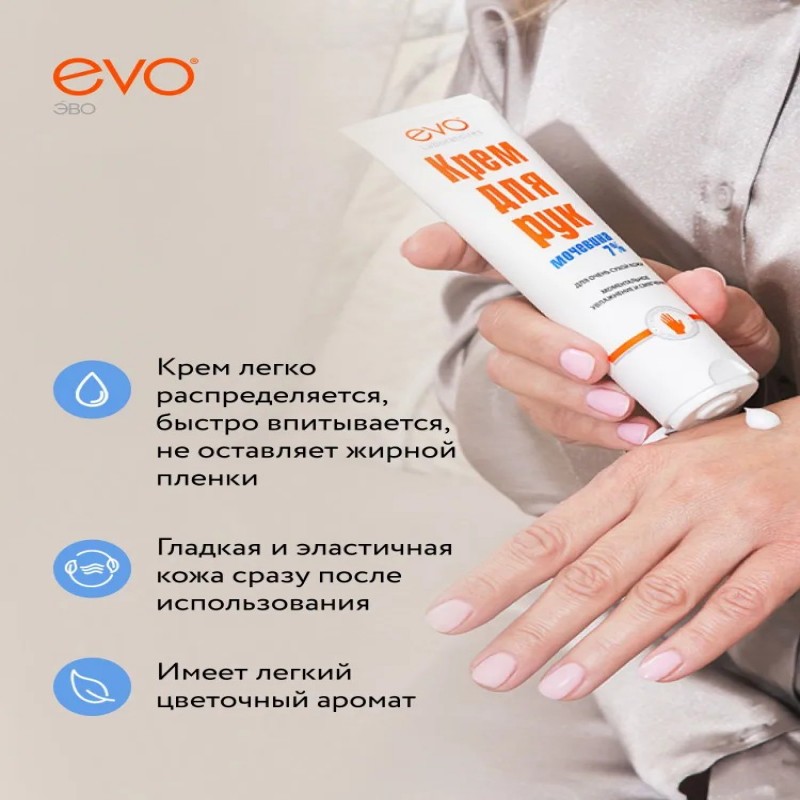 Благодаря оптимальной для очень сухой кожи рук концентрации мочевины 7% крем EVO моментально увлажняет и смягчает кожу делает её мягкой и гладкой на долгое время.